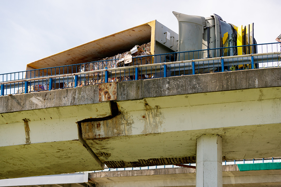 Naczepa się przewróciła, uszkodzone zostały bariery ochronne, a wjazd na trasę był przez wiele godzin zablokowany. Operacja postawienia na koła przewróconego pojazdu była wyjątkowo trudna nie tylko ze względu na jego rozmiary, ale także z powodu dużego kąta nachylenia wjazdu.