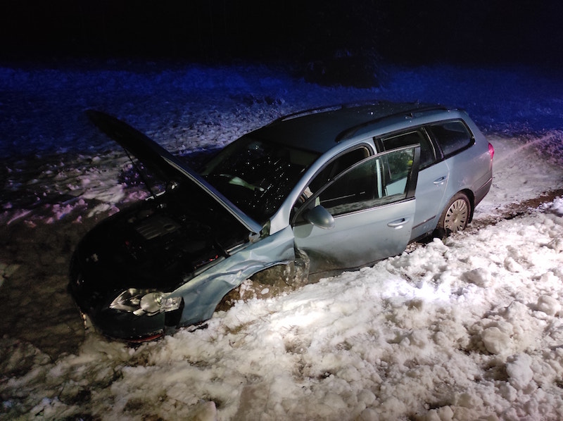 W policyjną, oznakowaną kię wjechał kierowca volkswagena passata, który nie zapanował nad kierownicą i wpadł w poślizg.