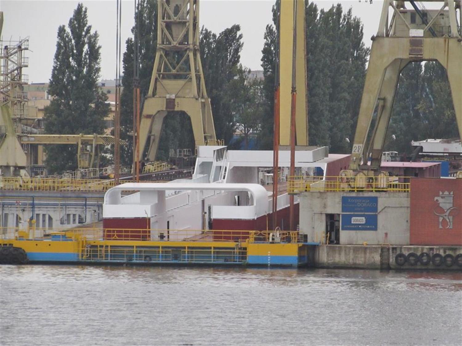 Końcowy montaż prowadzony jest na pochylni Wulkan Nowy, z której prom będzie wodowany.