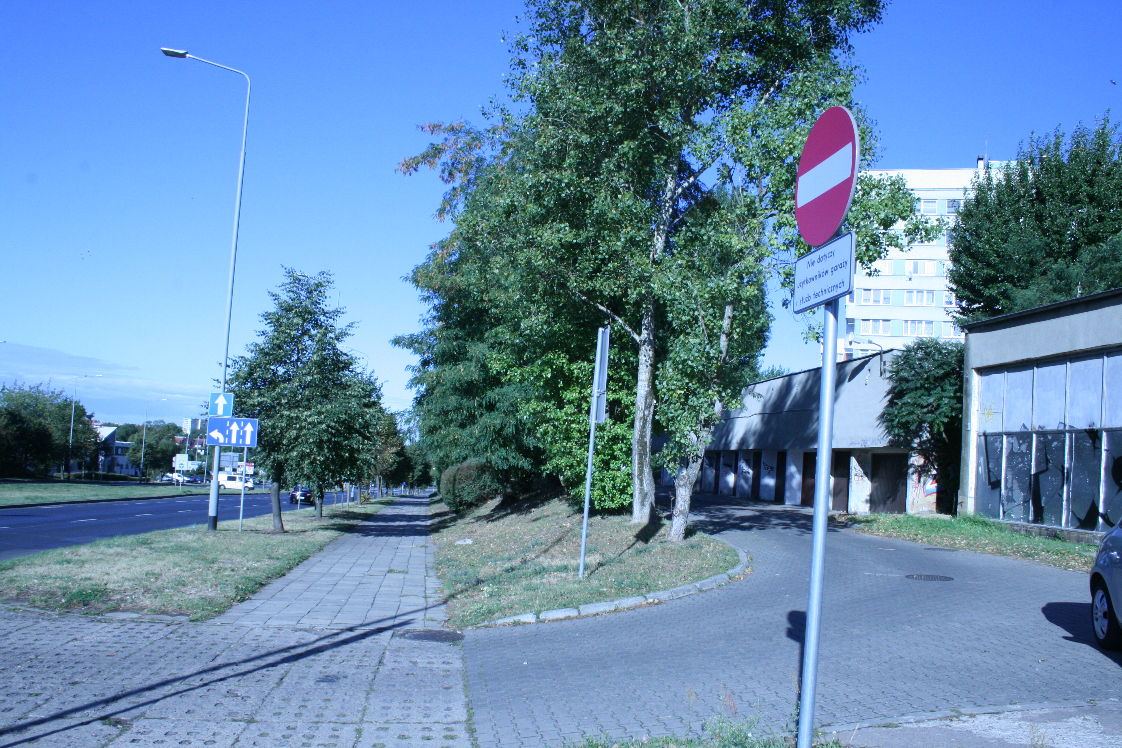 Na zdjęciu: Aby wjechać na osiedle, trzeba jechać aż do skrzyżowania (w głębi po lewej), tam odstać swoje na światłach, okrążyć osiedle i na nie wjechać. Jeszcze niedawno wystarczyło przejechać koło garaży po prawej stronie.