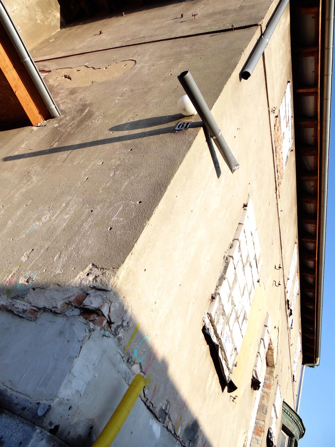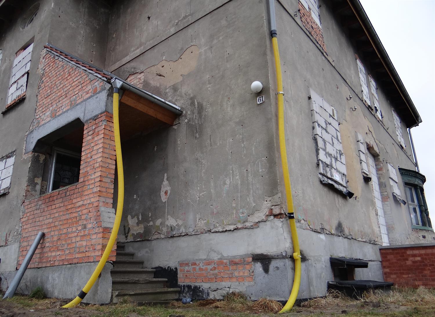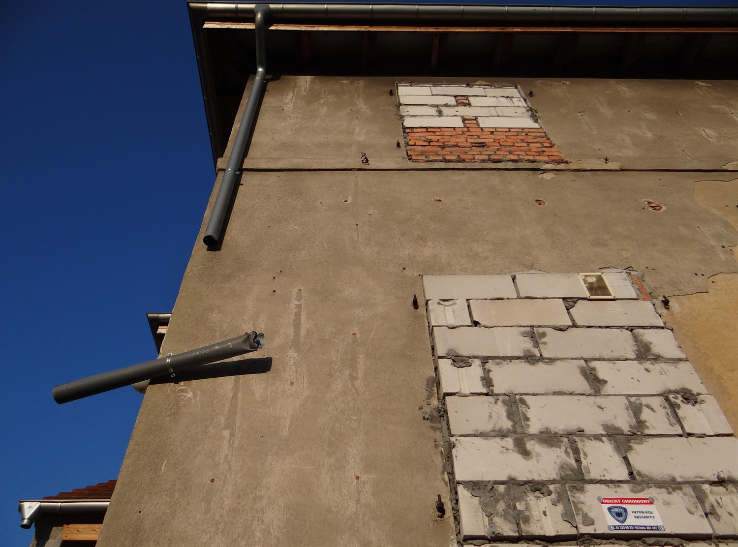 Dawna willa Grünebergów przy ul. Batalionów Chłopskich 61 w szczecińskich Zdrojach. Pustostan zabytkowy pod ochroną dewastowany. Po kradzieży nowych rynien z blachy ZBiLK zlecił montaż rur spustowych z tworzywa sztucznego. Taka prowizoryczna fastryga.