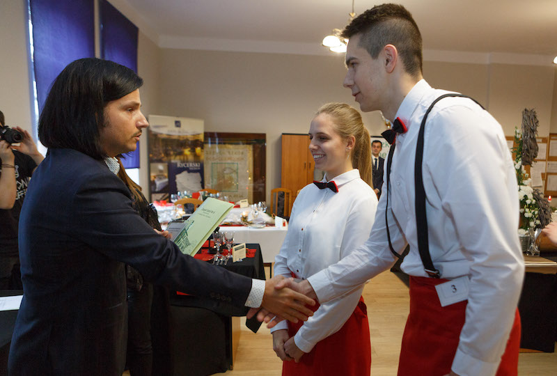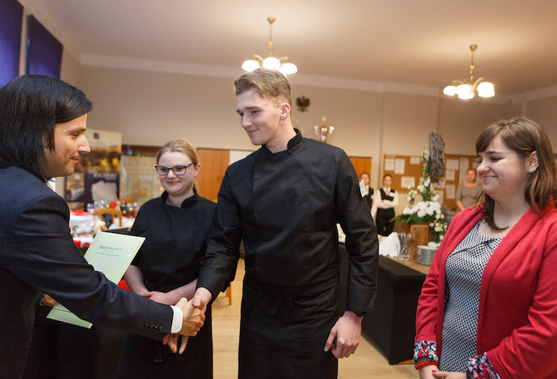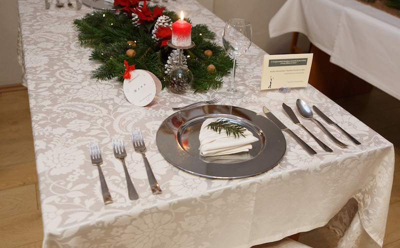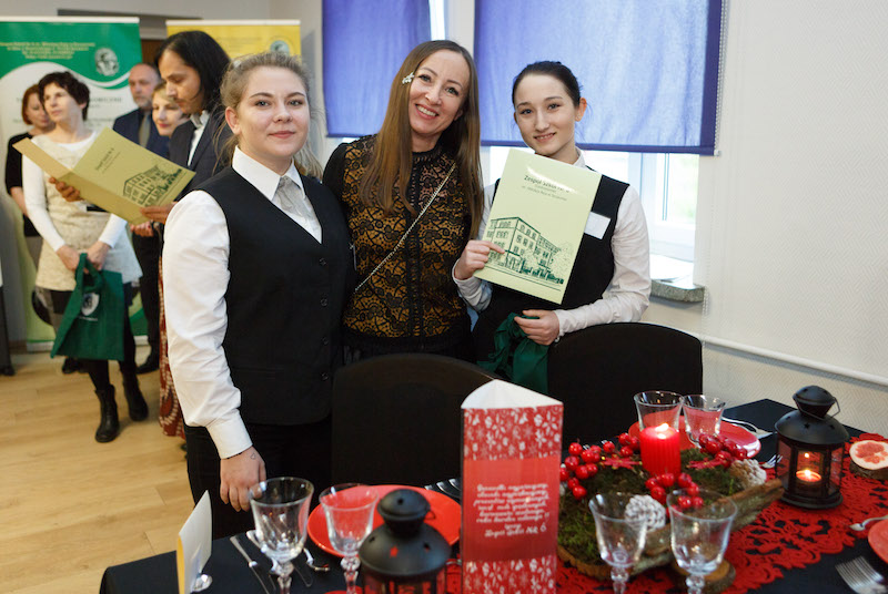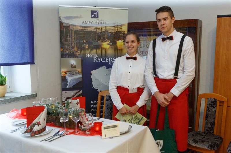Rozstrzygnięto także konkurs sztuki kelnerskiej pod hasłem "Coraz bliżej święta", w którym spośród zespołów z pięciu zachodniopomorskich szkół, nagrodzono najlepszych. Pierwsze miejsce zajęli uczniowie ZS1 w Koszalinie: Sandra Matuszak i Filip Jabłoński (na zdjęciu), drugie - Oliwia Frydrych i Klaudia Przybysz z ZSP w Kamieniu Pomorskim, a trzecie Paula Czerniawska i Weronika Gotowiecka z ZS6 w Szczecinie. Nagrodzeni uczniowie wykazali się największą wiedzą w zakresie nakrywania stołu oraz umiejętnościami w podawaniu dań.©℗