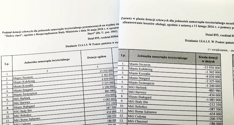 Wszyscy wójtowie, burmistrzowie i prezydenci otrzymali pismo wojewody zachodniopomorskiego informujące o decyzji nr 164/2018. Pismo ma dwa załączniki. Jeden z nich jest wykazem gmin i kwot, które otrzymują one na realizację programu „Dobry start” – po 300 zł na każdego ucznia, niezależnie od statusu materialnego rodziny. I tak np. miasto Szczecin otrzyma 13,95 mln zł, Stargard 2,325 mln zł, Goleniów 1,55 mln zł, a maleńka Stepnica – 226,3 tys. zł. Razem do wszystkich gmin trafi 68 445 520 zł.
