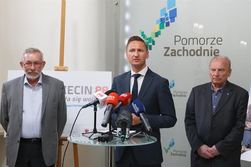Na zdjęciu od lewej: Edward Radziewicz, marszałek Olgierd Geblewicz oraz Andrzej Milczanowski opowiadali o znaczeniu dla polskiej historii szczecińskiego strajku z 1988 roku.