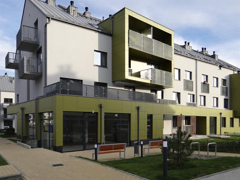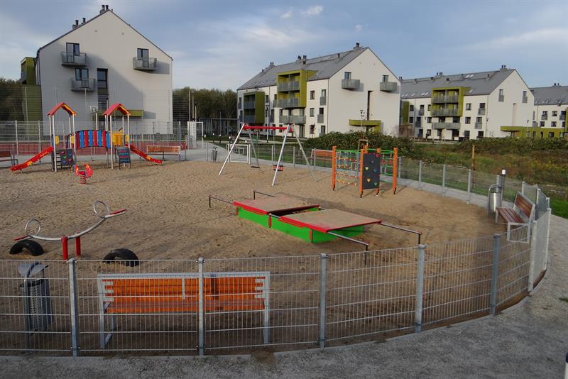 Pomiędzy budynkami urządzone są place rekreacyjne z pergolami, wielofunkcyjne boisko, plac zabaw, miejsca postojowe przypadające po jednym na mieszkanie, w tym miejsca dla osób niepełnosprawnych, drogi i chodniki. Do tego trawniki, na skarpach rabaty z krzewami, a dojścia do budynków wzdłuż parkingów i alejek obsadzone zostały drzewami.