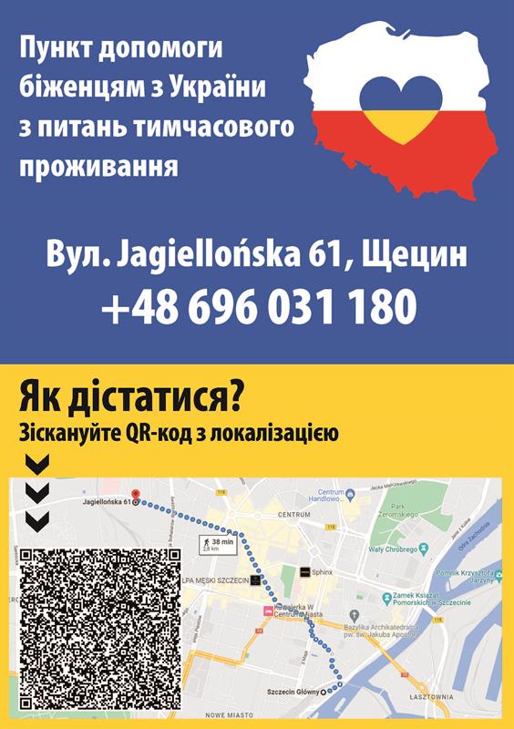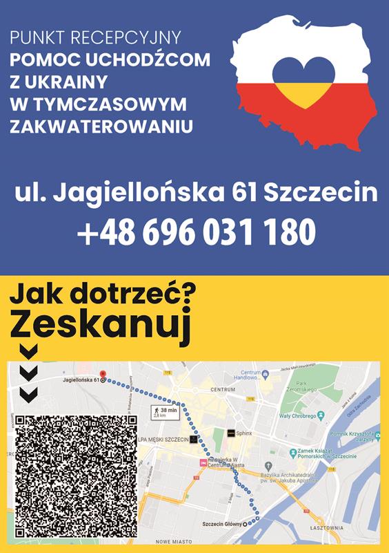 Nowa lokalizacja punktu recepcyjnego i pomocy dla uchodźców z Ukrainy to ul. Jagiellońska 61 w Szczecinie. Miejsce tymczasowego zakwaterowania znajdujące się dotychczas w hali przy ul. Sowińskiego 7 zostało przeniesione. Nadal oferowana będzie tam pomoc w postaci noclegu, wyżywienia, pomocy tłumacza oraz możliwość relokacji, tj. przewiezienia do docelowego punktu zakwaterowania w województwie zachodniopomorskim.