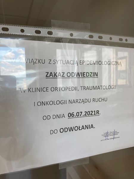 Zakaz odwiedzin w Klinice Ortopedii, Traumatologii i Onkologii Narządu Ruchu szpitala przy ul. Unii Lubelskiej w Szczecinie. Wprowadzono go we wtorek 6 lipca br. w związku z pacjentem z dodatnim wynikiem covid-19.