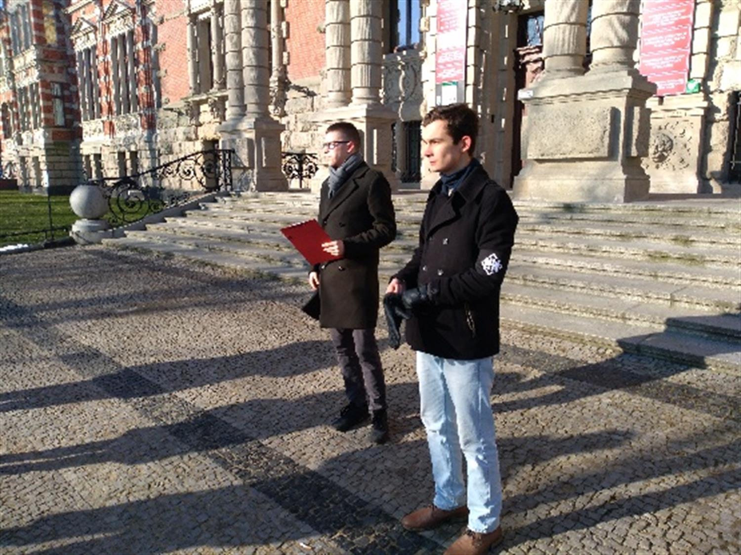 Na zdjęciu od lewej: Damian Adamus, prezes MW w regionie, oraz Wojciech Baran, wiceprezes szczecińskiego koła, przedstawili swoje stanowisko przed gmachem wojewody.