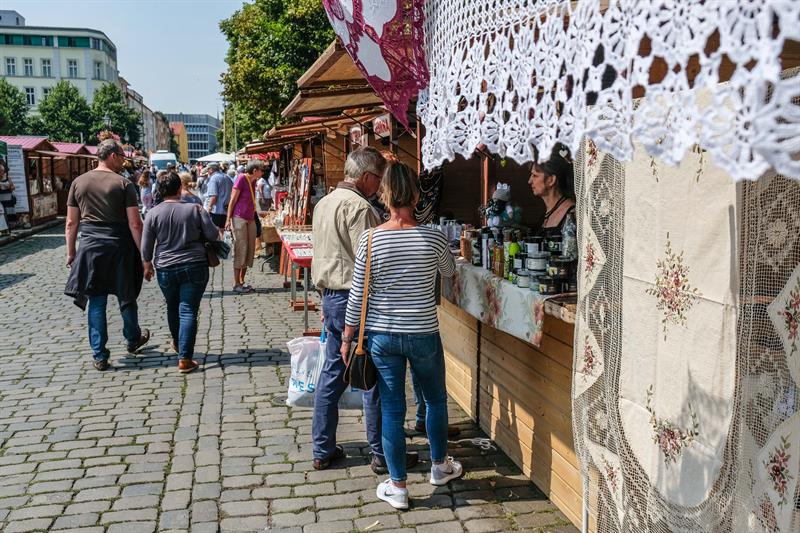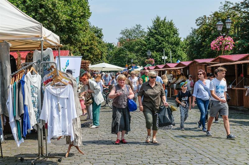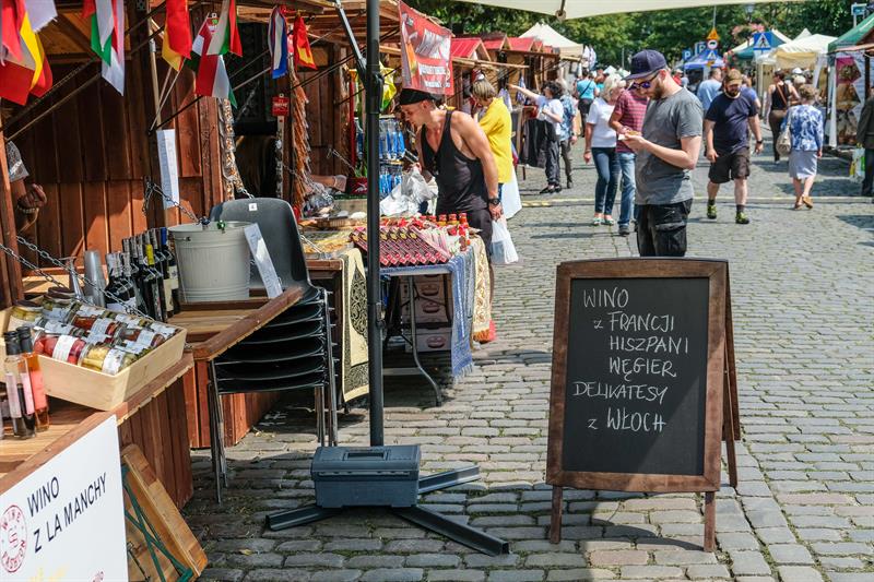 Czego tu nie ma - na straganach towar od średniowiecznych hełmów i łuków, przez obrusy i stringi z Koniakowa, kożuchy z Nowego Targu, poduszki z morskimi aplikacjami, lniane ubrania, chusty, torby, po ceramikę i ozdoby. Na stoiskach z żywnością kuszą chleby, miody, wędliny, staropolskie nalewki, sery, oleje, przyprawy, słodkości. Można kupić np. nasze rogale jakubowe z nadzieniem makowym i pierniki szczecińskie, litewski kwas chlebowy, chlebek żytni z tataraku, podpłomyki, hiszpańskie oliwki, dżemy i ciasta. Są też naturalne kosmetyki, mydła z Marsylii, zioła, biżuteria, zabawki.