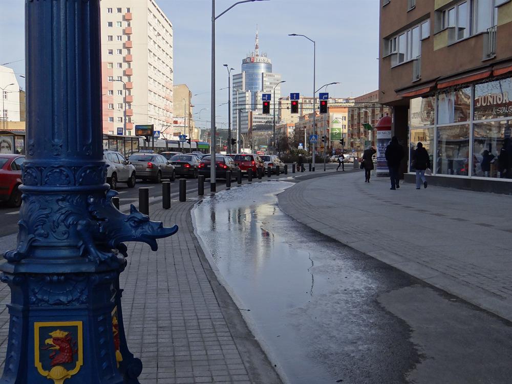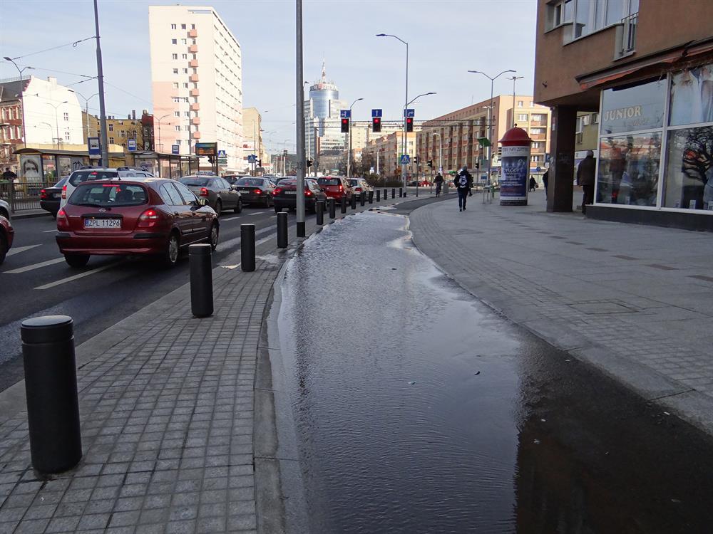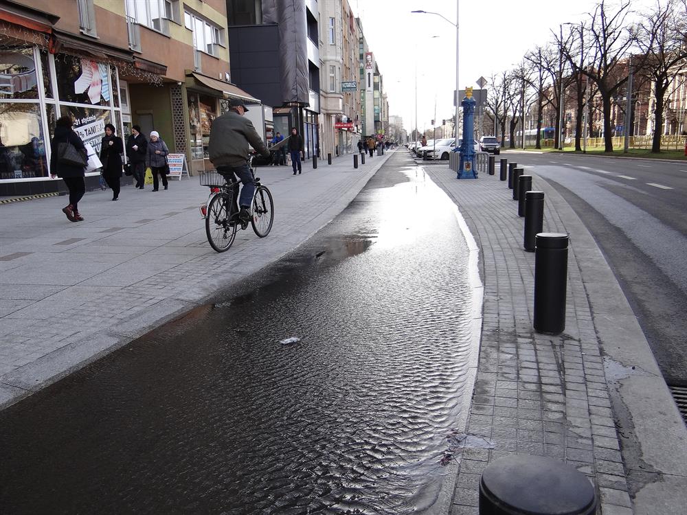 Pas ścieżki rowerowej na odcinku o wysokości przystanku przed pl. Żołnierza Polskiego, przed dojazdem do ronda, anektowany przez deszczówkę (przy mniej intensywnych opadach) zwykle na trzech czwartych szerokości w miniony poniedziałek i we wtorek był w całości zalany. Zatopioną ścieżkę cykliści omijali w związku z tym wielkim łukiem, czyli między pieszymi, jadąc chodnikiem.