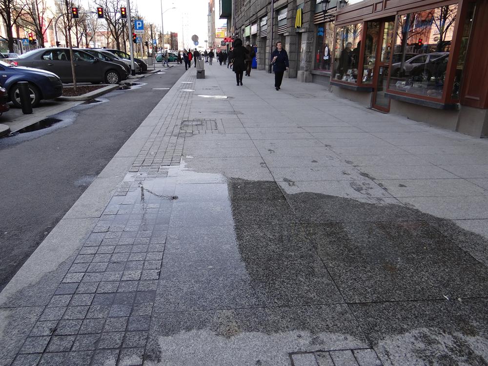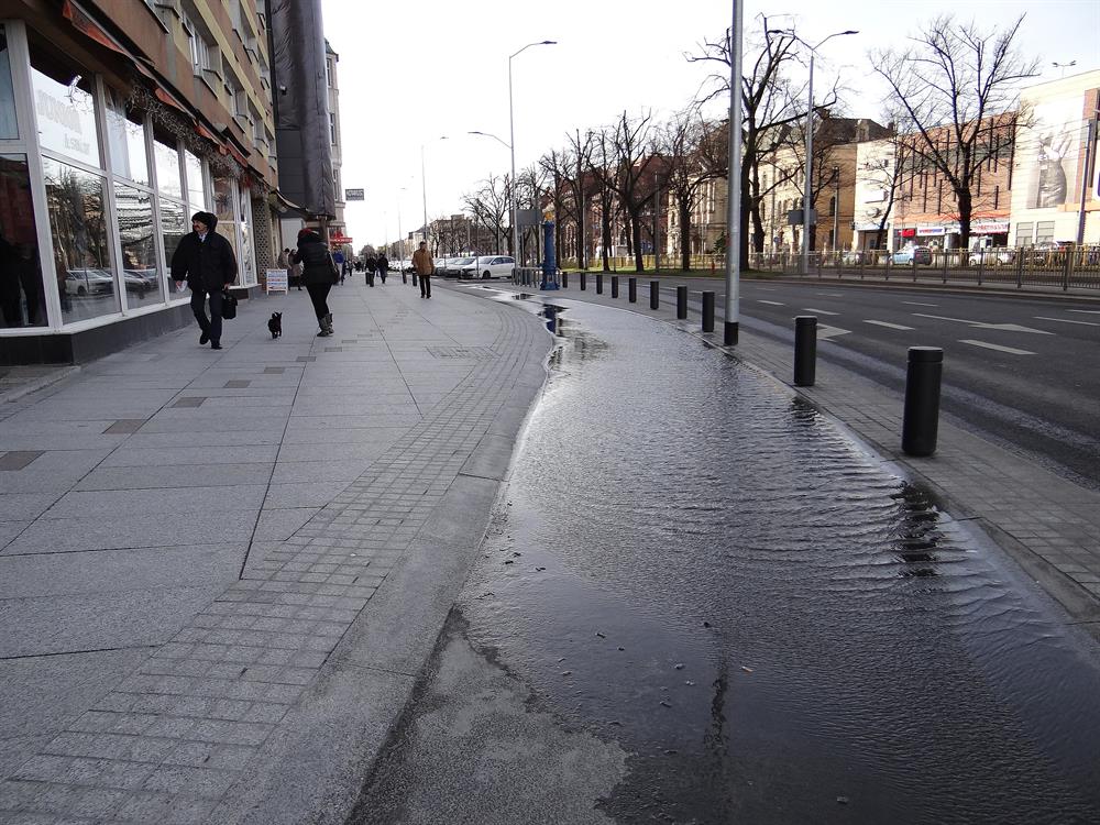 Woda z powodu nierównej nawierzchni i braku prawidłowo wyprofilowanych spadków nie jest w stanie spływać do studzienek także z rejonu przejścia przez jezdnię w połowie alei na wysokości dawnego Odzieżowca. Po kałużach piesi również brodzą na pasie ułożonego na nowo z płyt chodnika.