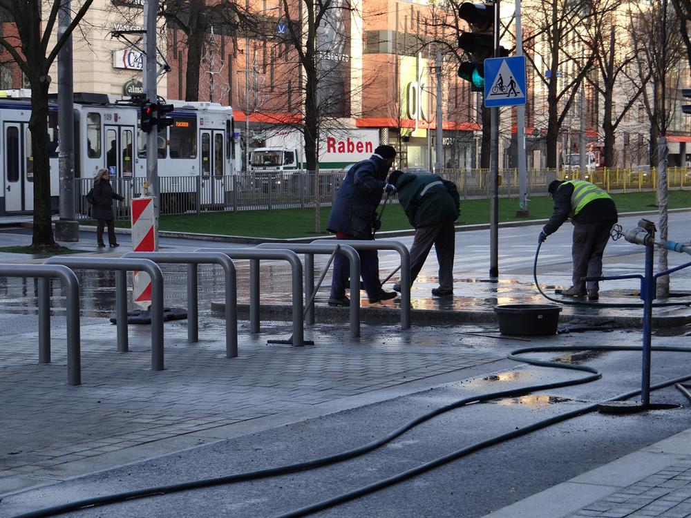 Niewykluczone, że nowa kanalizacja podziemna w wielu miejscach nie jest w stanie odbierać nadmiaru deszczówki, bo została zapchana jeszcze w czasie inwestycji. Wtedy to, na początku grudnia ubiegłego roku, robotnicy zaprawą cementową uzupełniali szczeliny w bruku i płytach chodnikowych, a nadmiar lepiszcza spływał przy okazji studzienkami do nowej instalacji ściekowej.