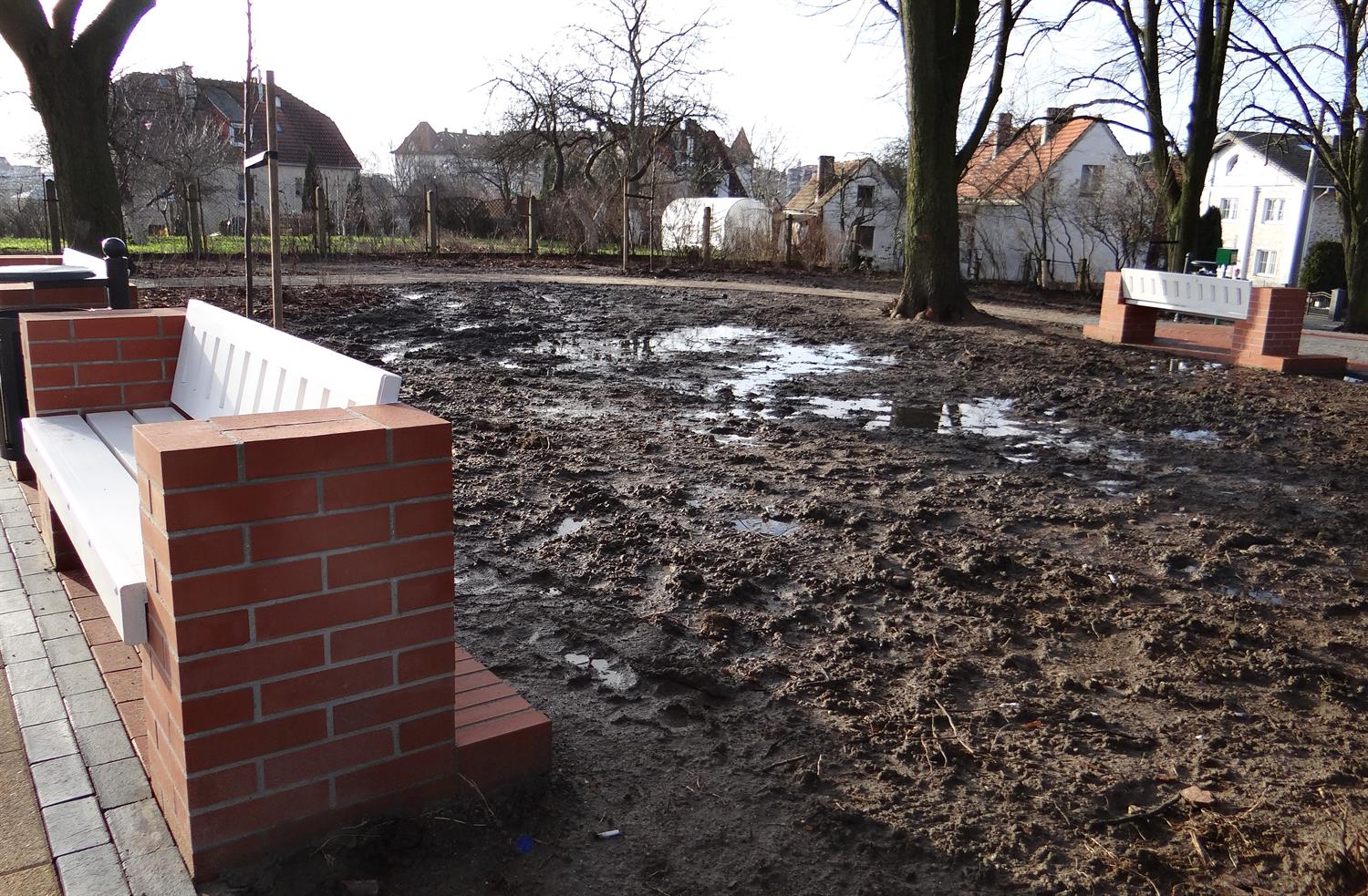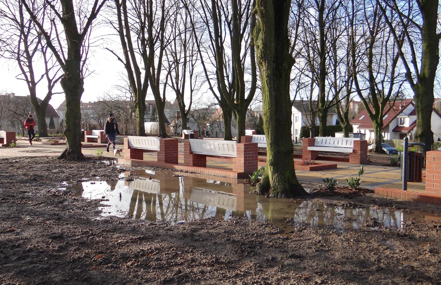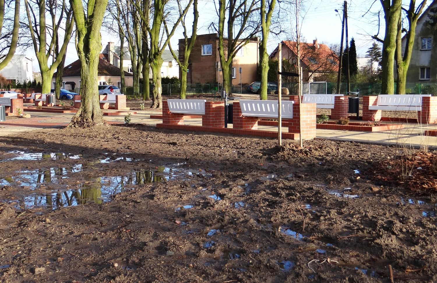 Obrzeżem części wypoczynkowej są strefy rekreacyjne dla małych i dużych, czyli bogato zaaranżowany plac zabaw oraz plenerowa siłowni (całość za blisko 370 tysięcy złotych). Niestety, to właśnie w tej pierwszej trawniki jeszcze w grudniu utonęły w wodzie i błocie. Teraz można po nich przejść suchą stopą tylko dlatego, że zamarzły. Gdy przyjdzie odwilż…