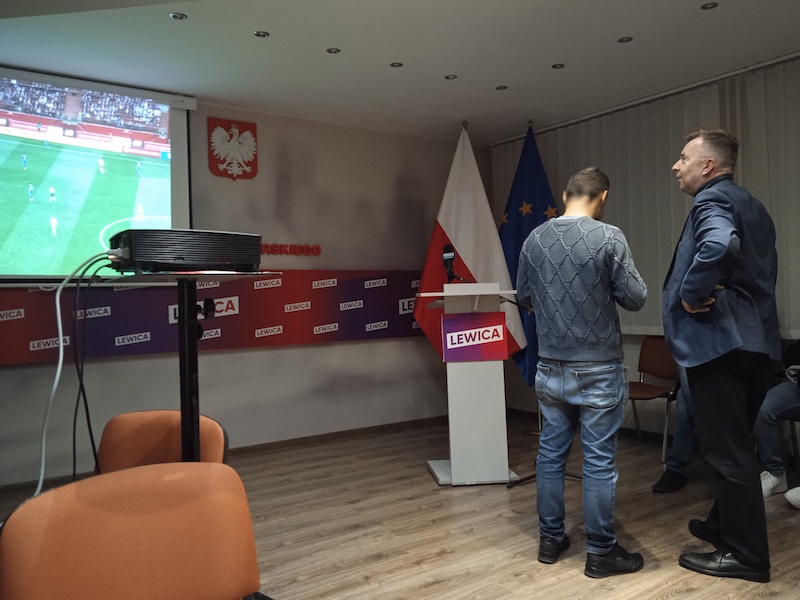 Szczecińscy działacze Prawa i Sprawiedliwości zorganizowali wieczór wyborczy w swojej siedzibie przy ul. Adama Mickiewicza. Na pół godziny przed końcem ciszy wyborczej dziennikarze wciąż czekali na ważnych polityków partii. Na sali włączony jest telewizor nastawiony na TVP Info”. (as)