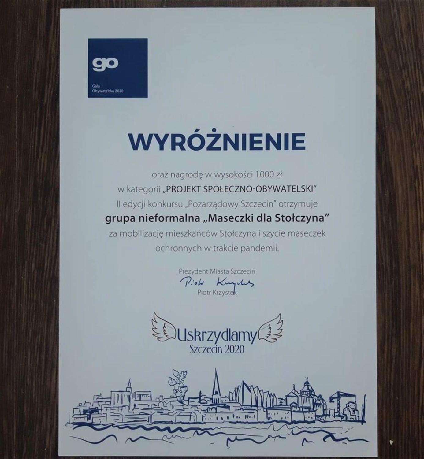 W marcu i kwietniu br. dziesięć pań ze Stołczyna włączyło się do akcji szycia tak potrzebnych wówczas maseczek. Inni mieszkańcy pomagali je roznosić do skrzynek pocztowych. Jeszcze inny przekazywali materiały i gumki. Miasto, które organizuje konkurs "Pozarządowy Szczecin" niedawno wyróżiiło ten społeczno-obywatelski projekt nieformalnej grupy "Maseczki dla Stołczyna", doceniając niezywykłą moblilizacje mieszkańców w trudnym czasie pandemii. Do grupy trafiła nagroda pienieżna - tysiąc złotych. Wszystkie panie jednogłośnie zdecydowały, że pieniądze przekażą na cel charytatywny.