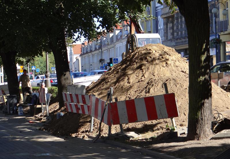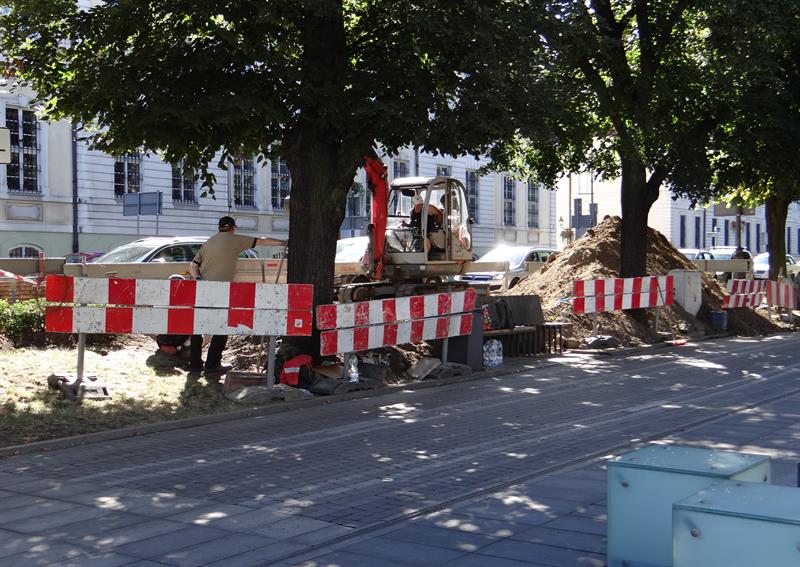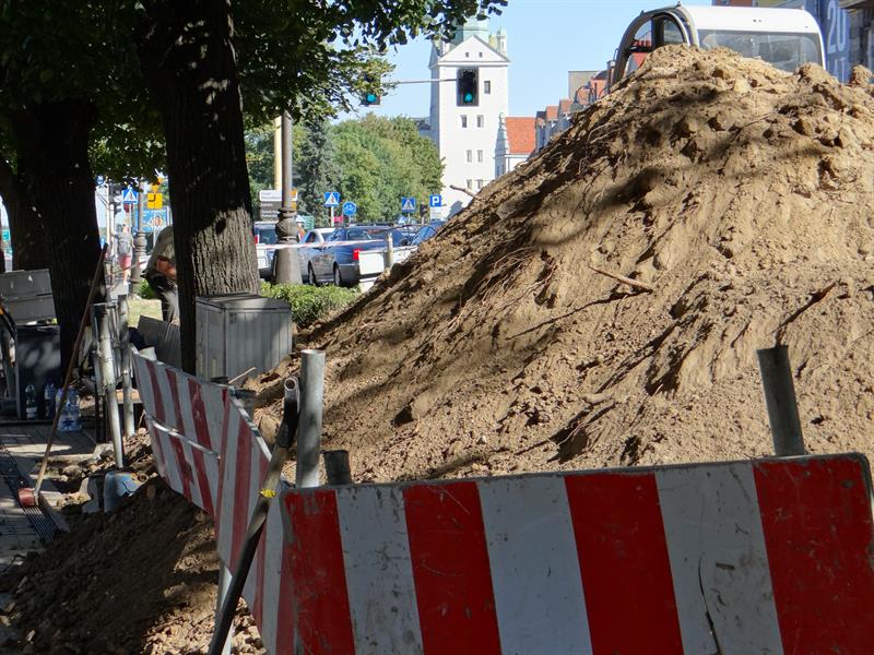 Koparka stoi na wysokości szklanych sześcianów, a bliżej słonecznego zegara. Na tym odcinku została rozebrana ścieżka rowerowa. Wykop jest prowadzony na pasie zielonym pomiędzy lipami. Ma sięgnąć kilka metrów pod ziemię, aż do przebiegającego tamtędy wodociągu o średnicy 40 cm.