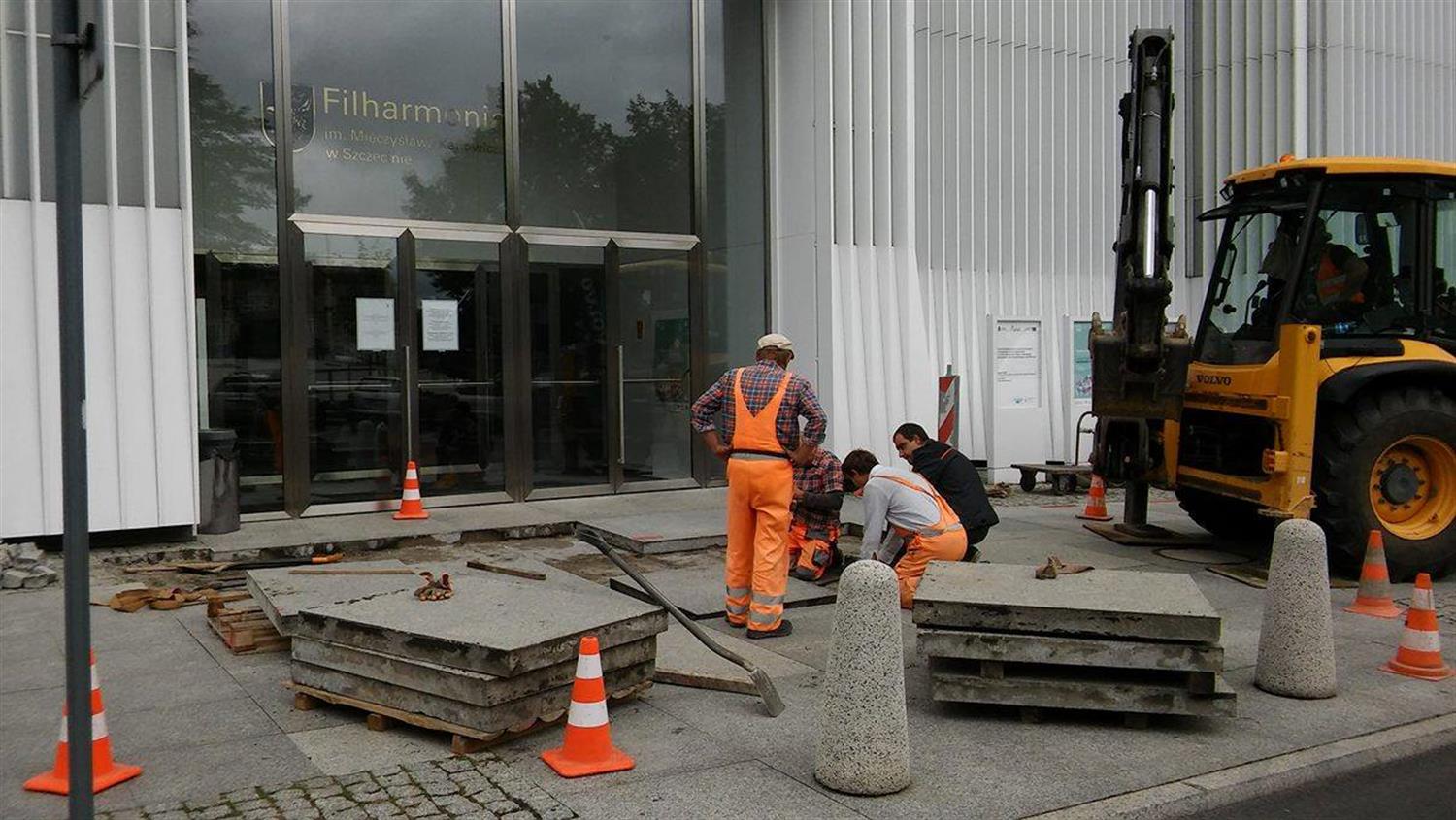 Przed wejściem do szczecińskiej filharmonii trwa wymiana uszkodzonych płyt. Prace mają zostać zakończone we wtorek (22.bm.). Tak jak w każdy poniedziałek gmach instytucji jest zamknięty.