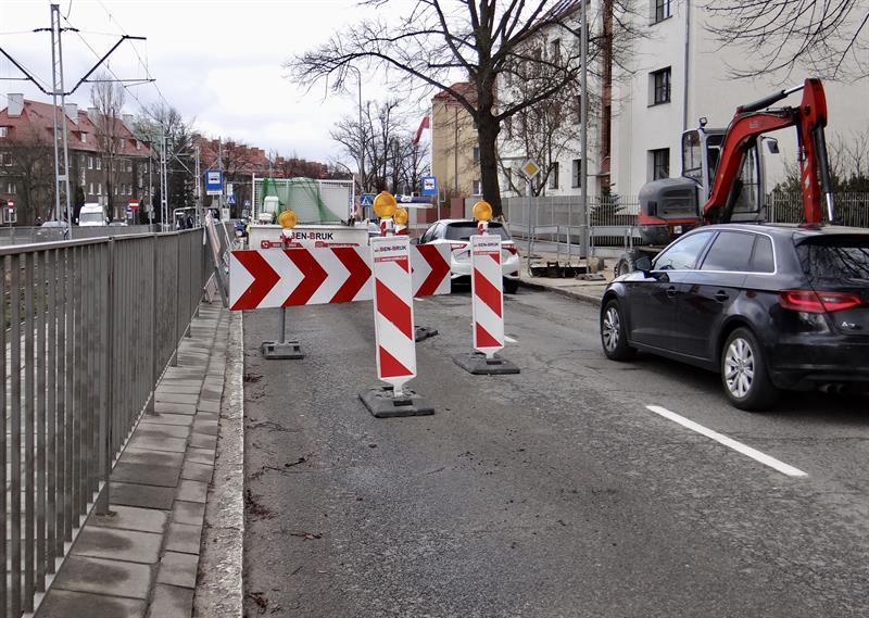 Nadal utrudniony jest przejazd samochodami nitka jezdni ul. Mickiewicza w kierunku Krzekowa na wysokości przystanku tramwajów od strony jej skrzyżowania z ul. Brzozowskiego. Trwają tam już od kilku tygodni prace drogowe przy urządzaniu wyniesień spowalniających ruch w tym rejonie. Do tej pory na długości kilkudziesięciu metrów pasa chodnika do przejścia dla pieszych ułożona została nowa nawierzchnia. Na podobnej długości nitki jezdni ich wykonawca uporał się też dotąd ze sfrezowaniem na całej szerokości starej warstwy asfaltowej nakładki.