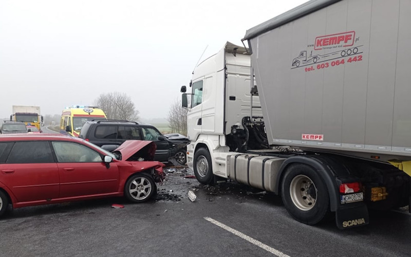W zdarzeniu brały udział dwa auta osobowe i ciężarówka.