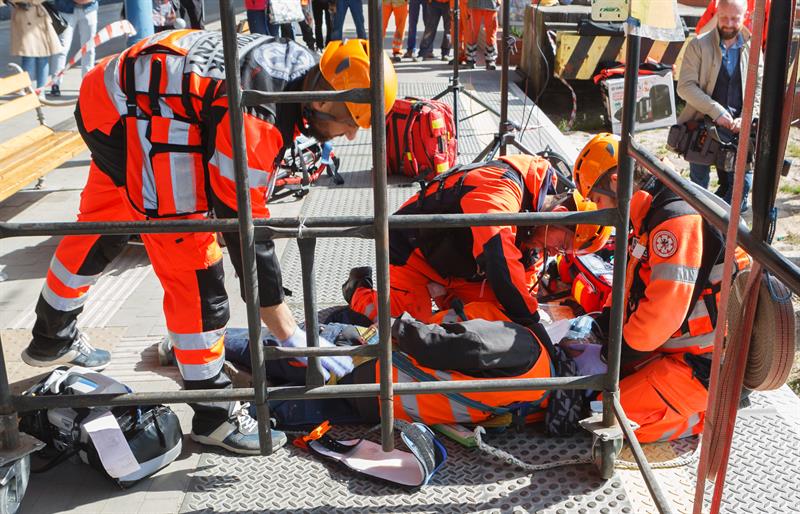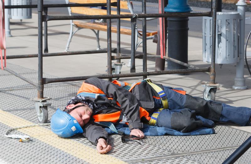 Człowiek spadł z rusztowania na Dworcu Głównym w Szczecinie. Na szczęście była to tylko symulacja niebezpiecznego wypadku w pracy. Przeprowadzono ją w środę (15 maja).