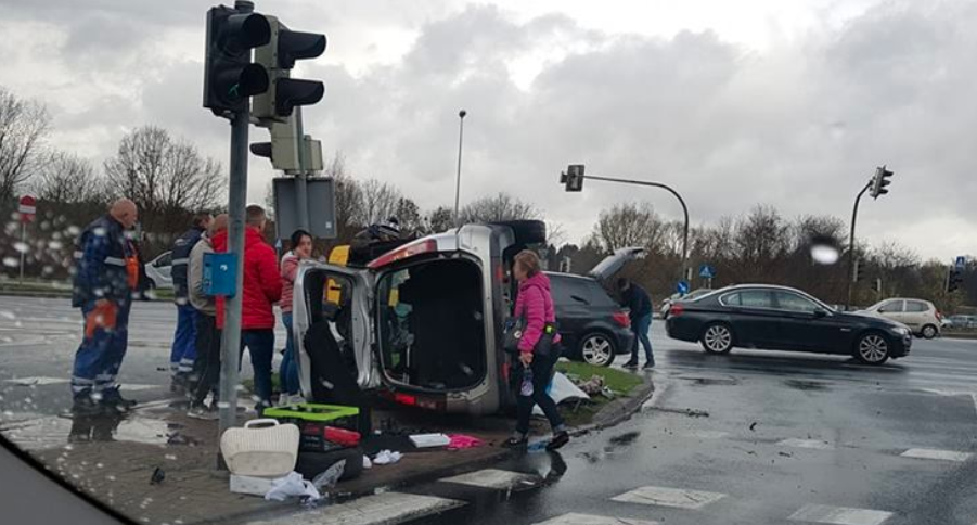 Do zderzenia dwóch samochodów doszło przed godz. 14 na ulicy Mieszka I w Szczecinie. Jedno z aut leży na boku. Funkcjonariusze policji kierują ruchem.