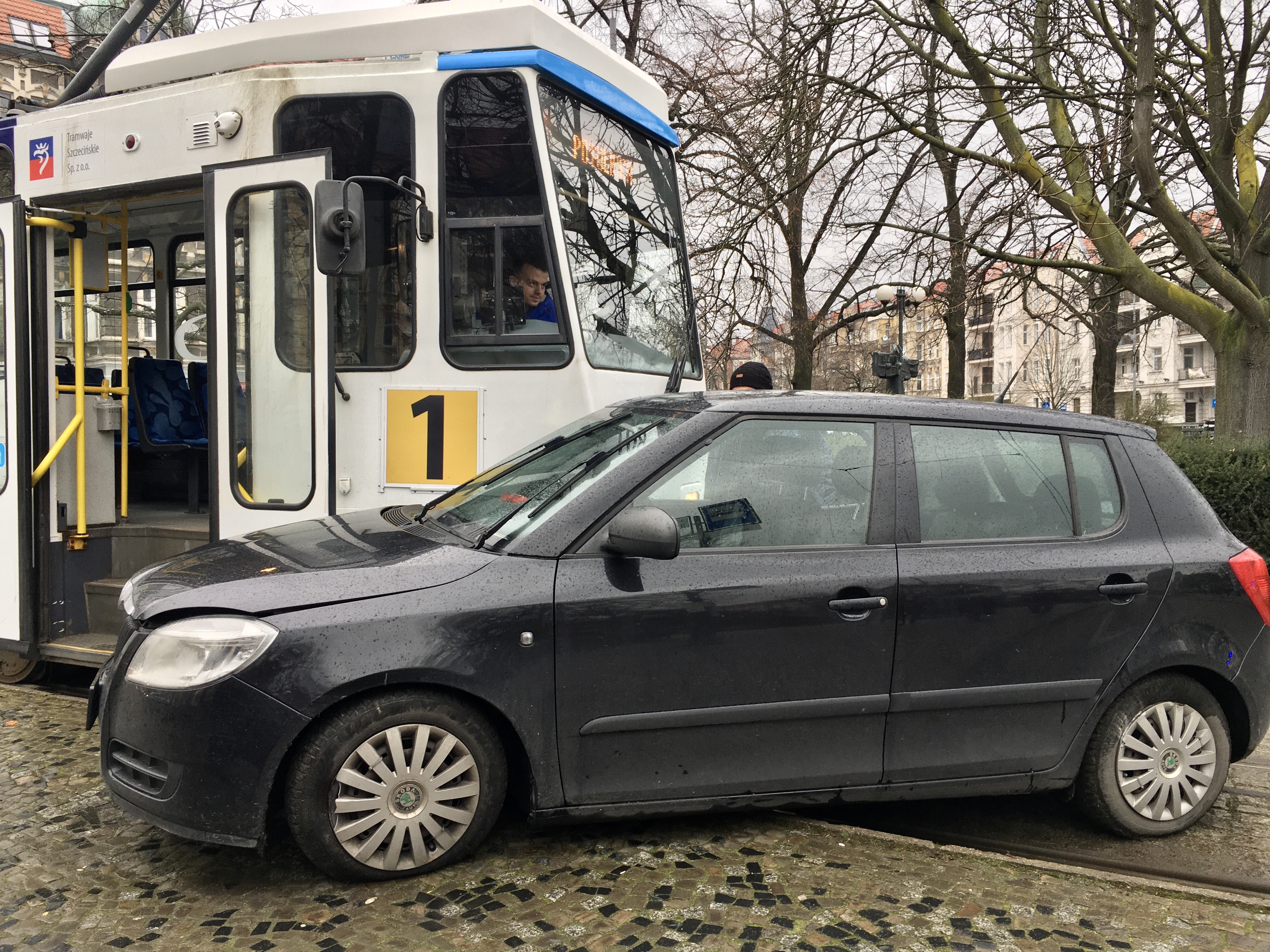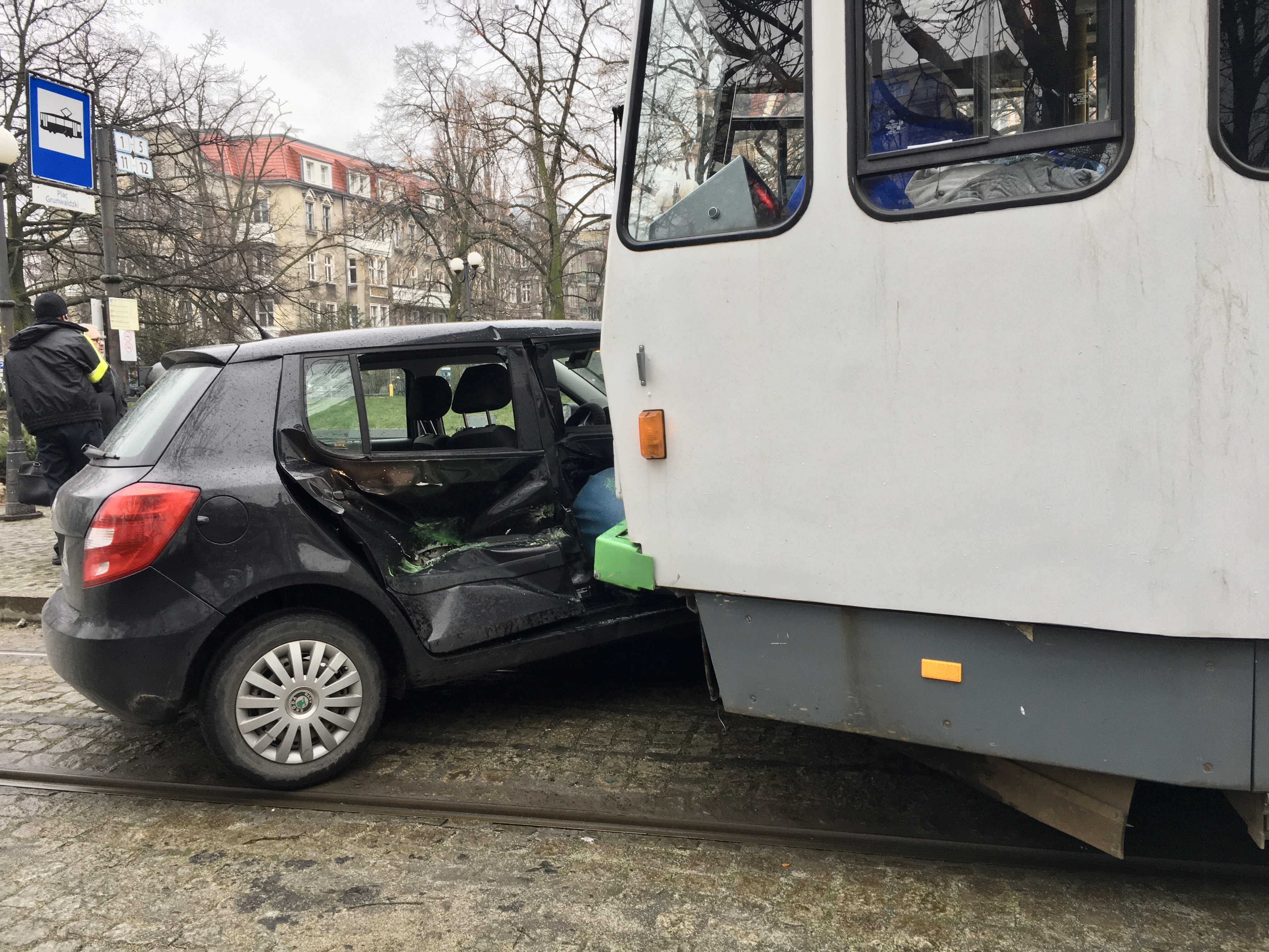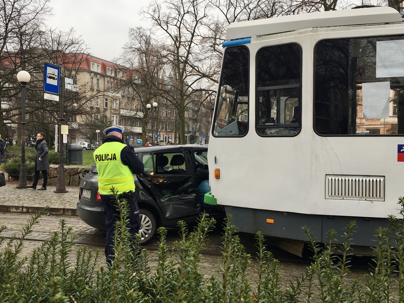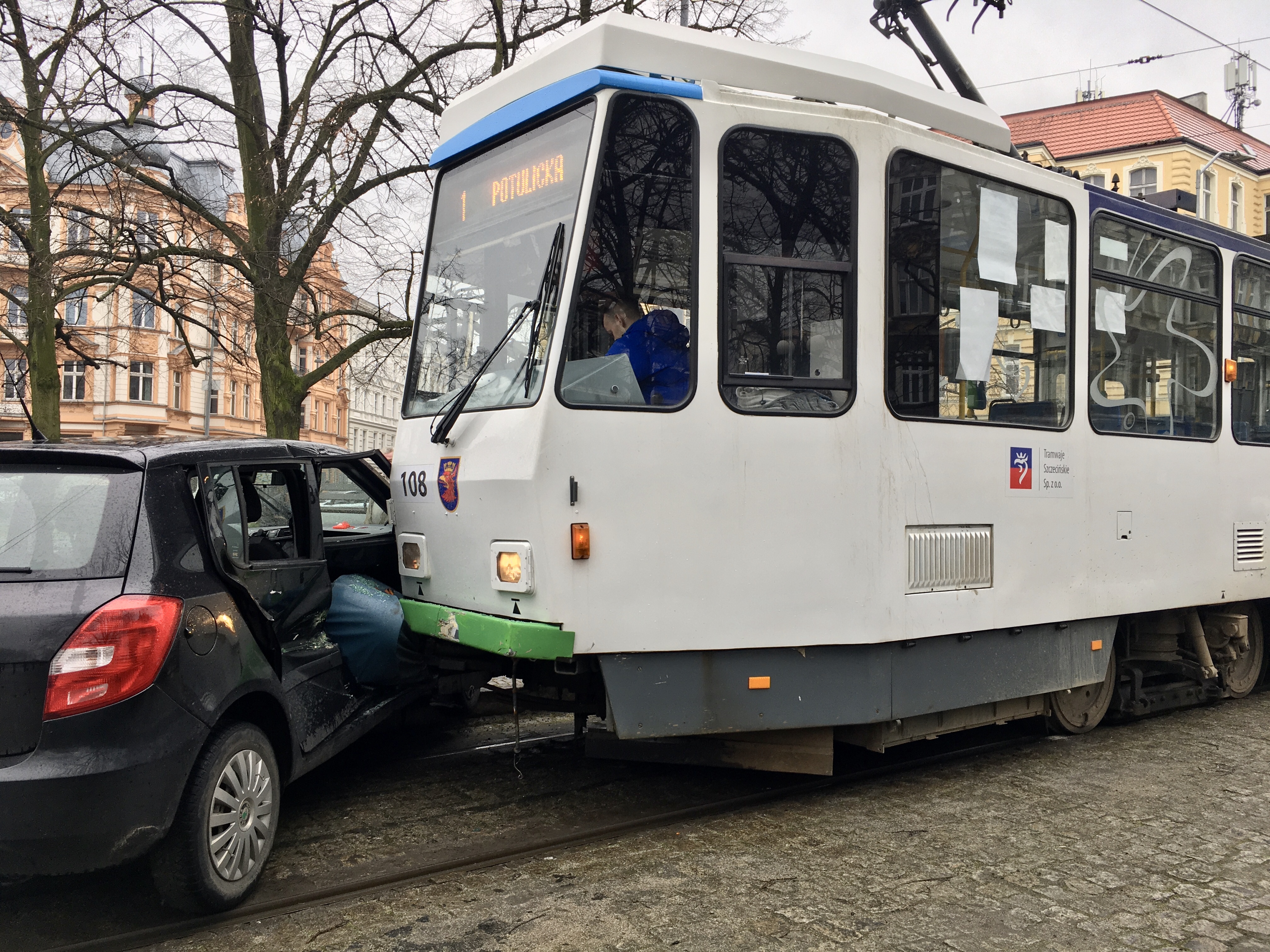Wypadek na pl. Grunwaldzkim w Szczecinie. Tramwaj linii 1 zderzył się z osobową skodą. Nie kursują do pl. Rodła tramwaje linii 1, 5, 11 i 12. Tor jest zablokowany przez pojazdy na wysokości przystanku.