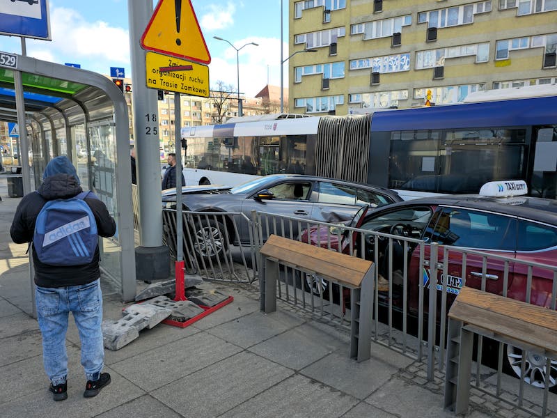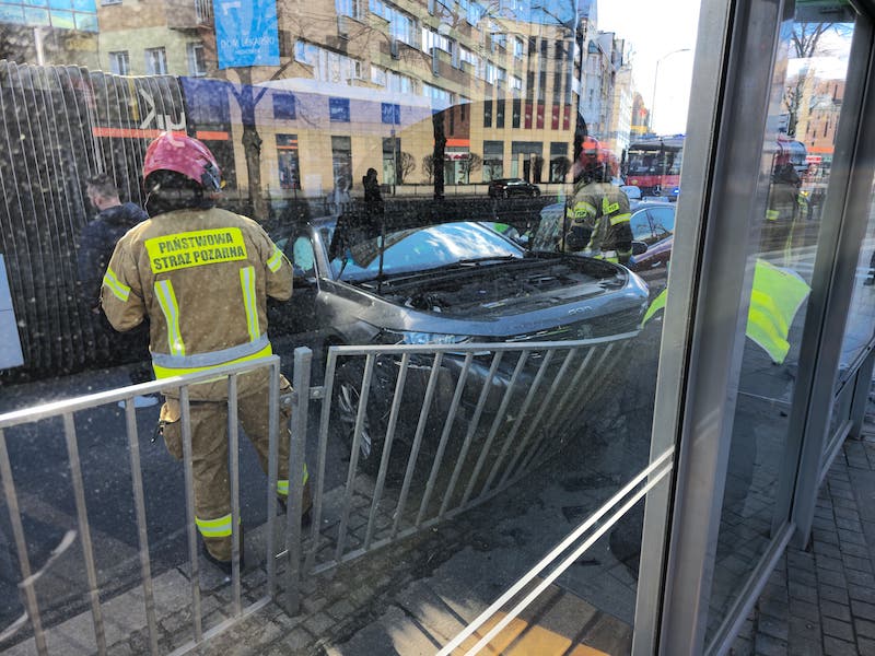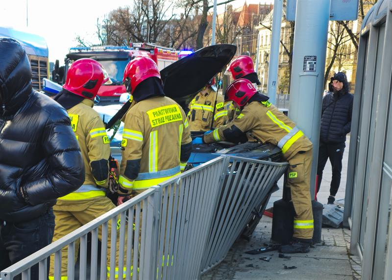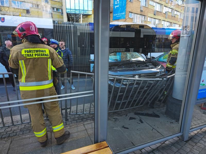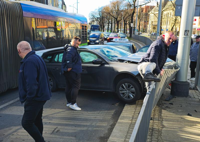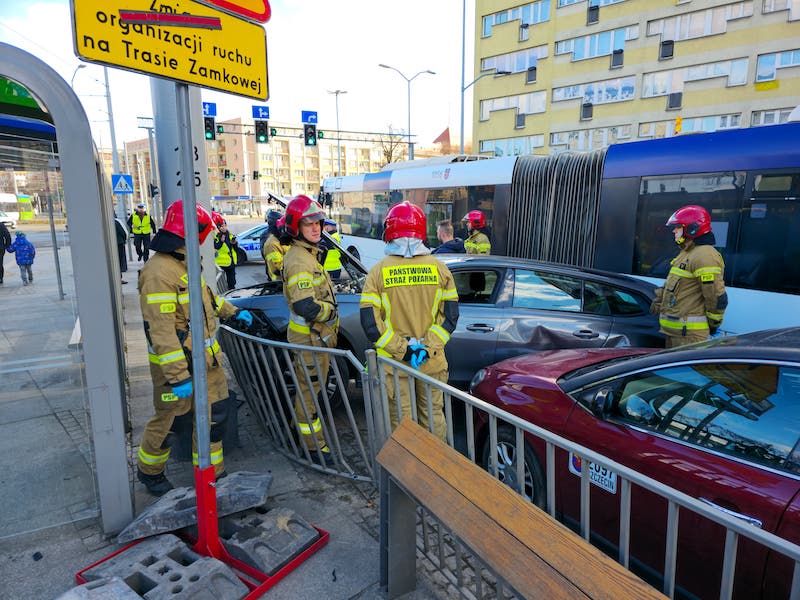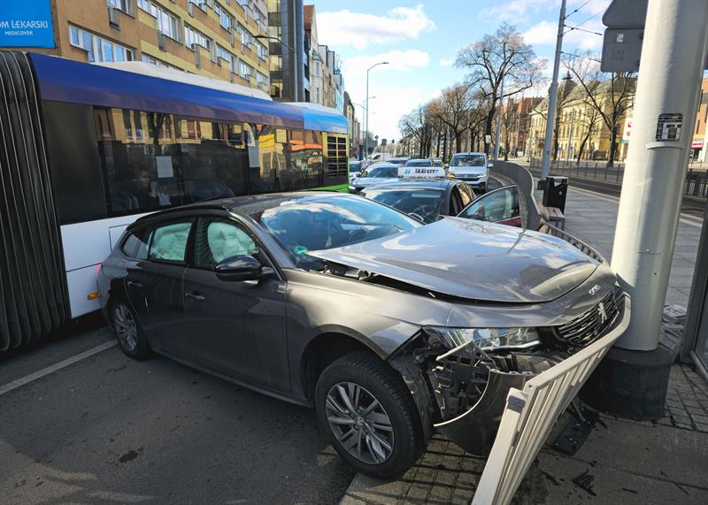 Samochód marki Peugeot uderzył w barierkę przy przystanku naprzeciwko Galerii Kaskada prawdopodobnie w wyniku wcześniejszego zderzenia się z taksówką. Na miejscu są dwa wozy Straży Pożarnej, która usuwa skutki wypadku i wycieki z samochodów. Nie ma poszkodowanych. Są spore utrudnienia w ruchu, dwa pasy z al. Niepodległości w kierunku pl. Rodła są zajęte. Tworzą się korki.