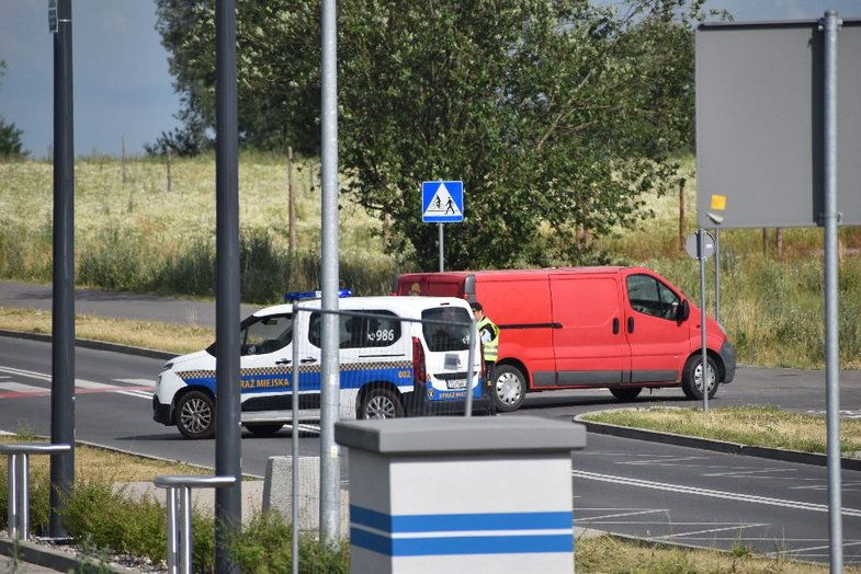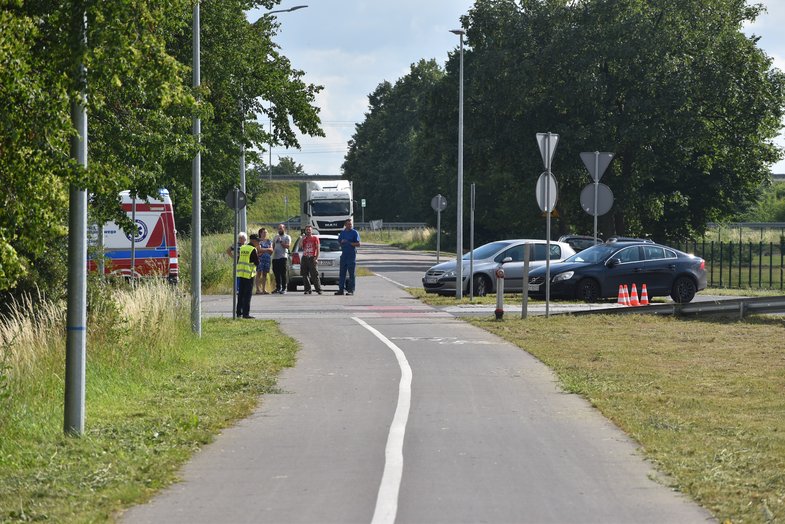 Samochód zjeżdżał z ronda i zniżał się do przejścia rowerowo pieszego.