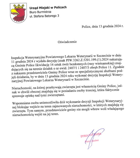 W sprawie świnek wietnamskich gmina Police wydała oświadczenie. Oto jego treść: