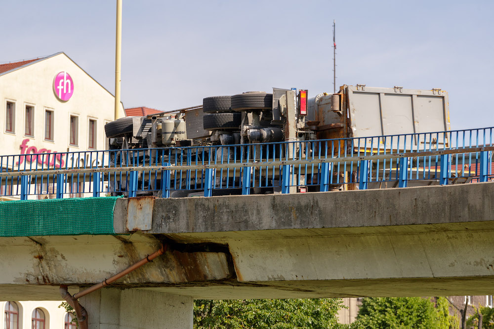Wjazd na Trasę Zamkową od strony Nabrzeża Wieleckiego jest zablokowany - i będzie zablokowany jeszcze przez kilka godzin. Ciężarówkę trzeba bowiem podnieść i dopiero wtedy będzie moźna ją usunąć stamtąd.