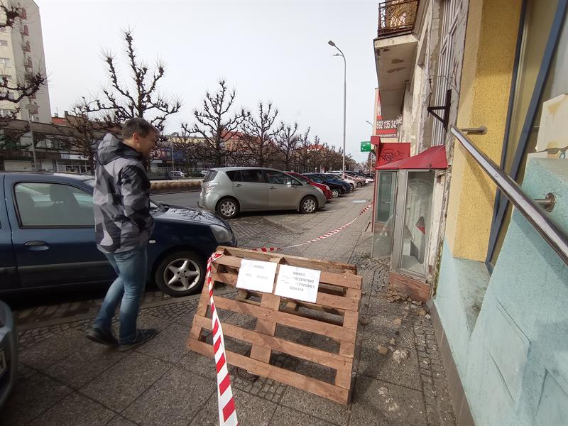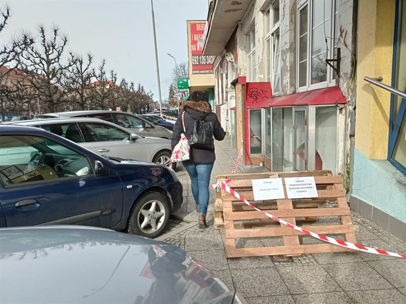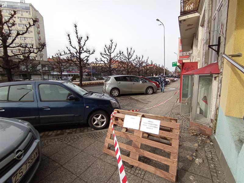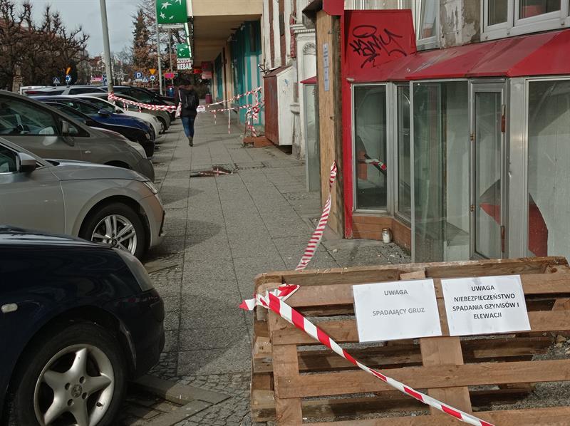 "Uwaga: spadający gruz" oraz "Uwaga: niebezpieczeństwo spadania gzymsów i elewacji" - te ostrzeżenia pojawiły się przy wiekowej - choć już odnawianej - kamienicy w al. Papieża Jana Pawła II nr 1, z której wiatr wywiał spore płaty tynku oraz detale architektoniczne zdobiące elewację. Chodnik prowizorycznie zabezpieczono paletami oraz taśmą. W dwóch newralgicznych punktach piesi muszą schodzić na jezdnię. Nie ma ograniczenia dla parkowania samochodów, ale rozważniej będzie zrezygnować z pozostawienia auta na tym odcinku alei.