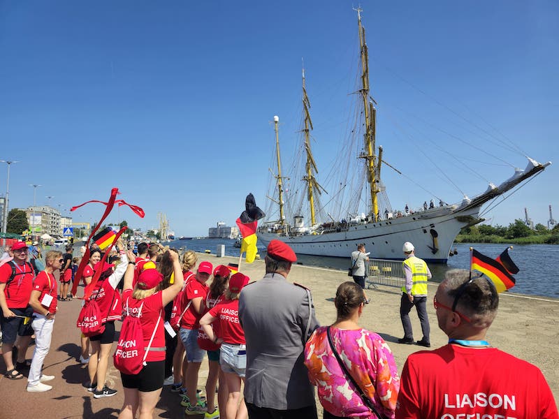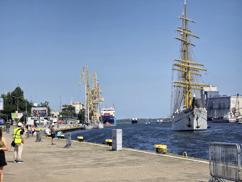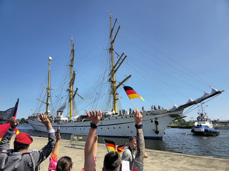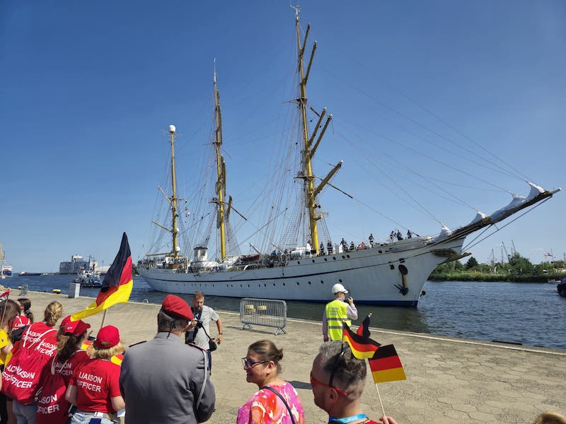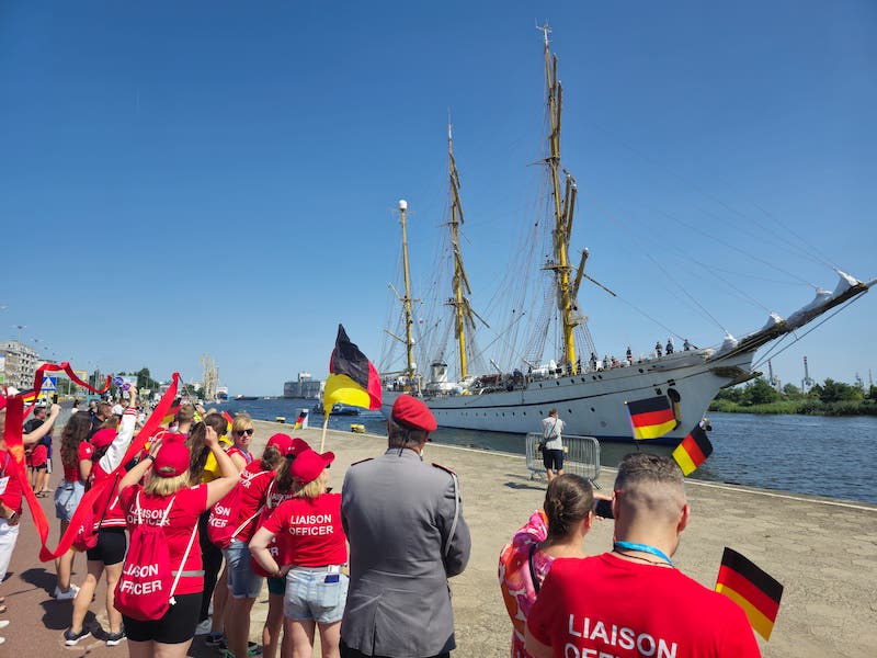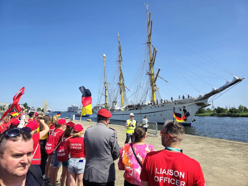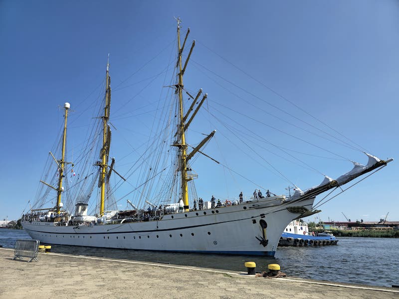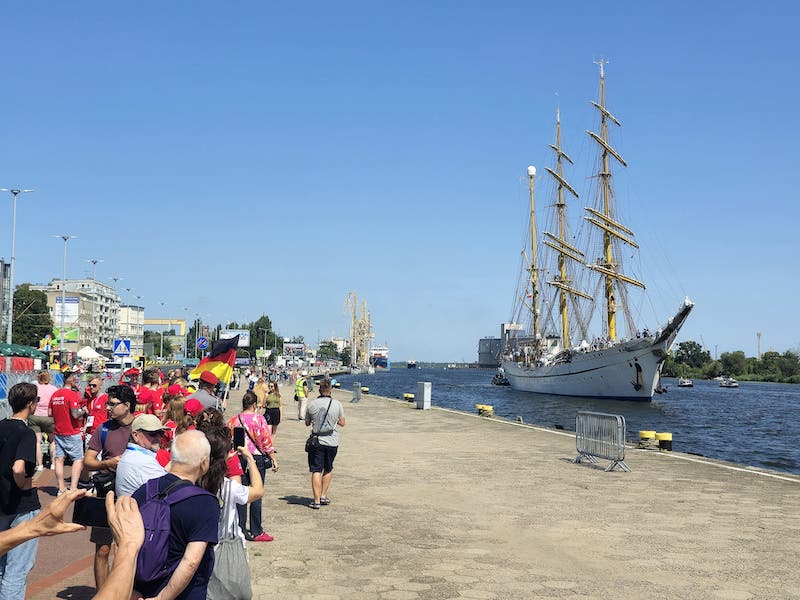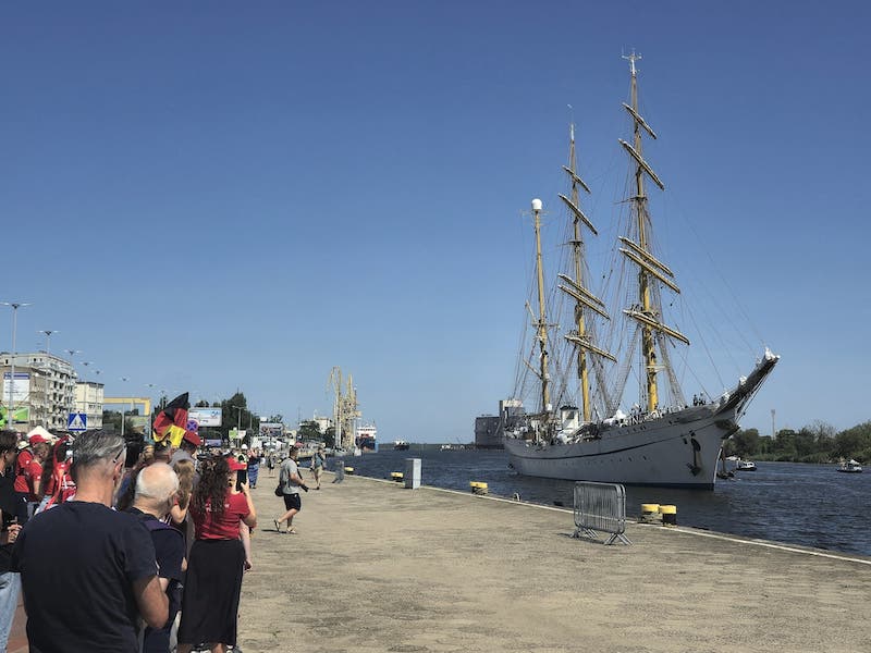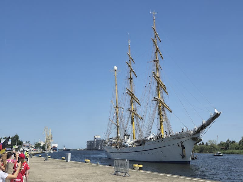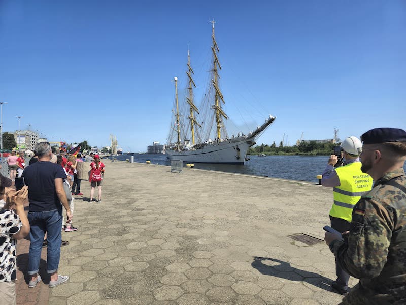 Żaglowiec szkolny niemieckiej marynarki wojennej STS Gorch Fock II zacumował w czwartek u stóp szczecińskich Wałów Chrobrego. Statek pojawił się przy nabrzeżu punktualnie o godzinie 14.00. Na powitanie zabrzmiała syrena okrętowa cumującej przy tym samym nabrzeżu barkentyny ORP Iskra. Wśród witających okręt byli zarówno szczecinianie jak i liczni turyści.