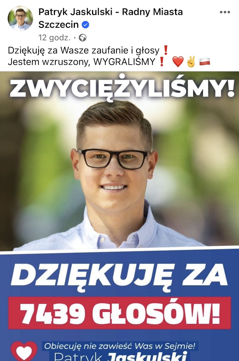 Gratulacje Panie Patryku. Wyrazy podziwu dla Patryka Jaskulskiego, była to skuteczna i energiczna kampania wyborcza.