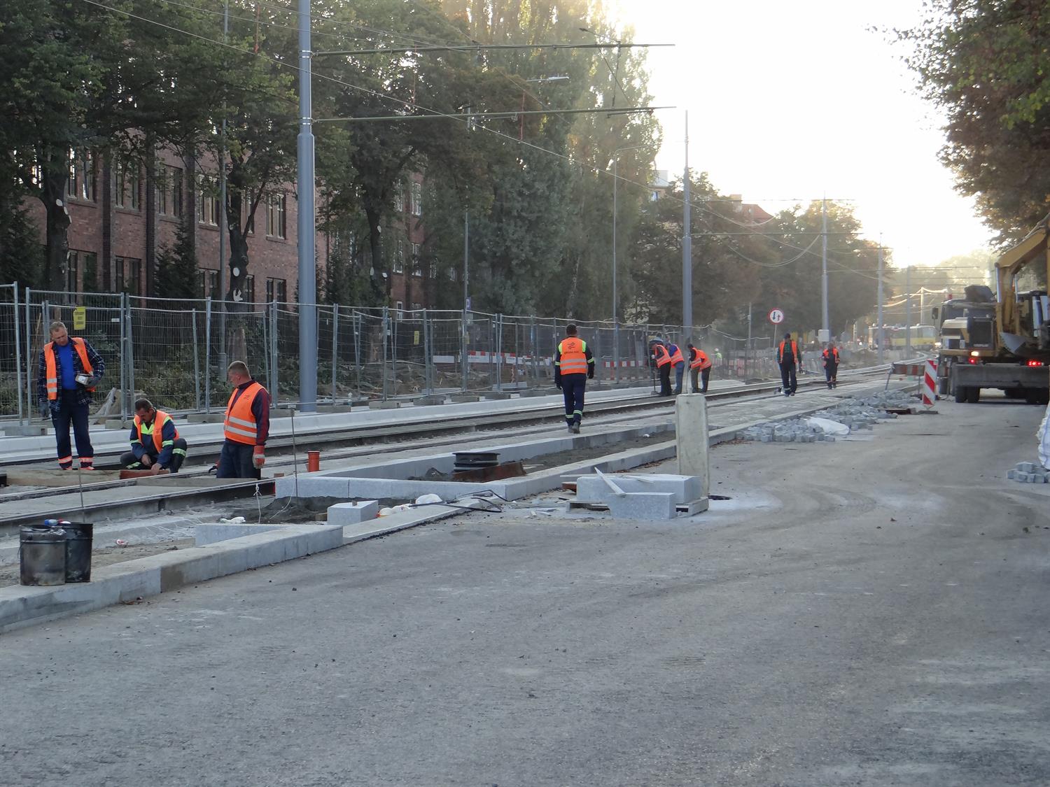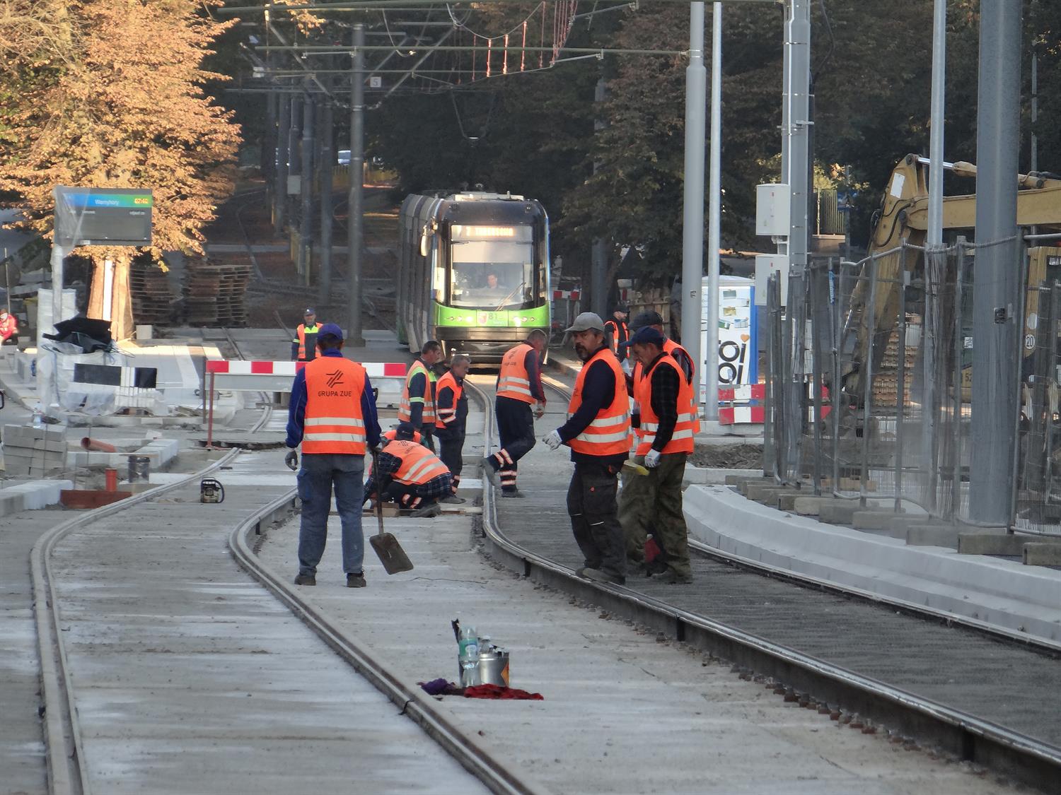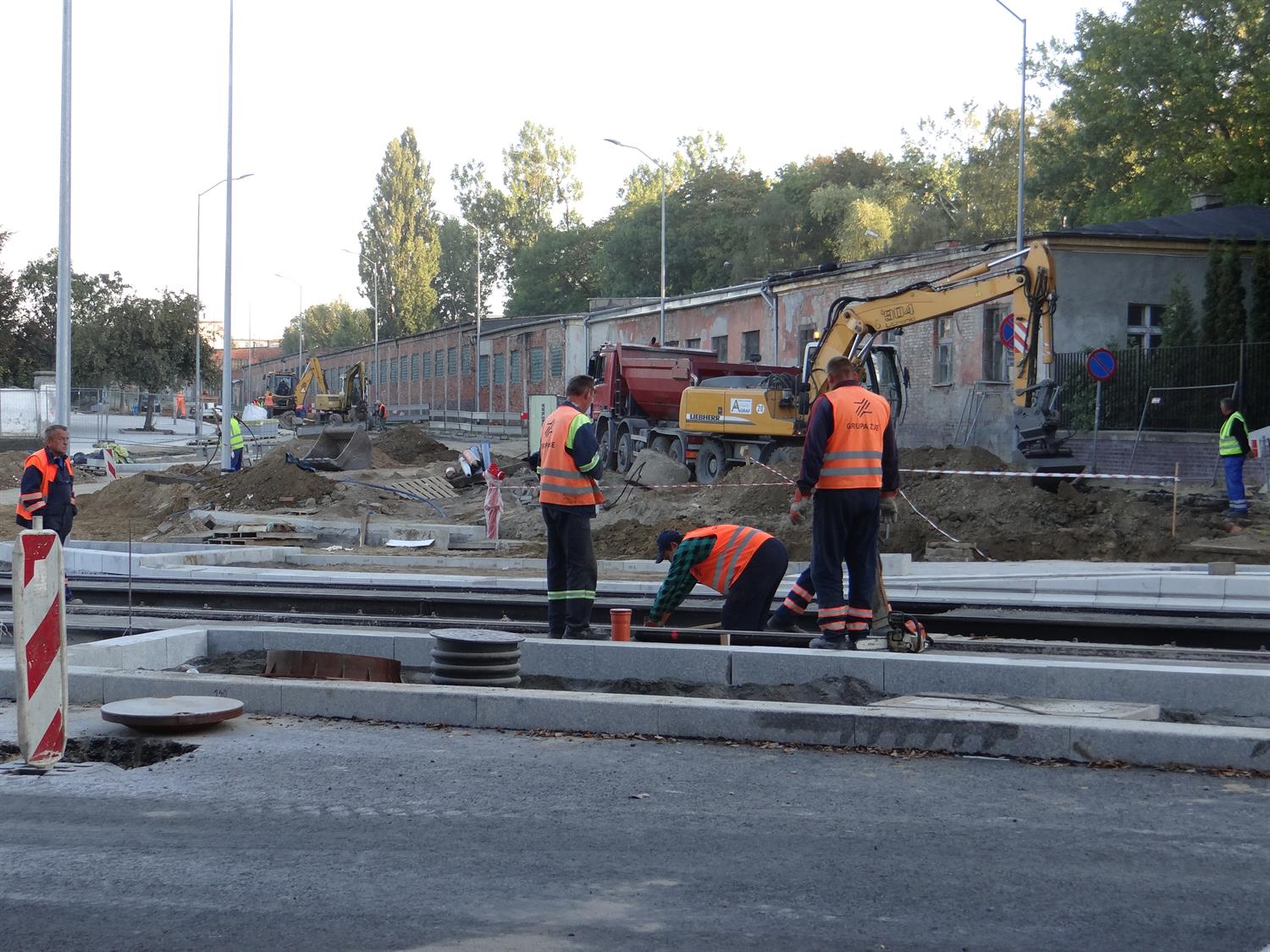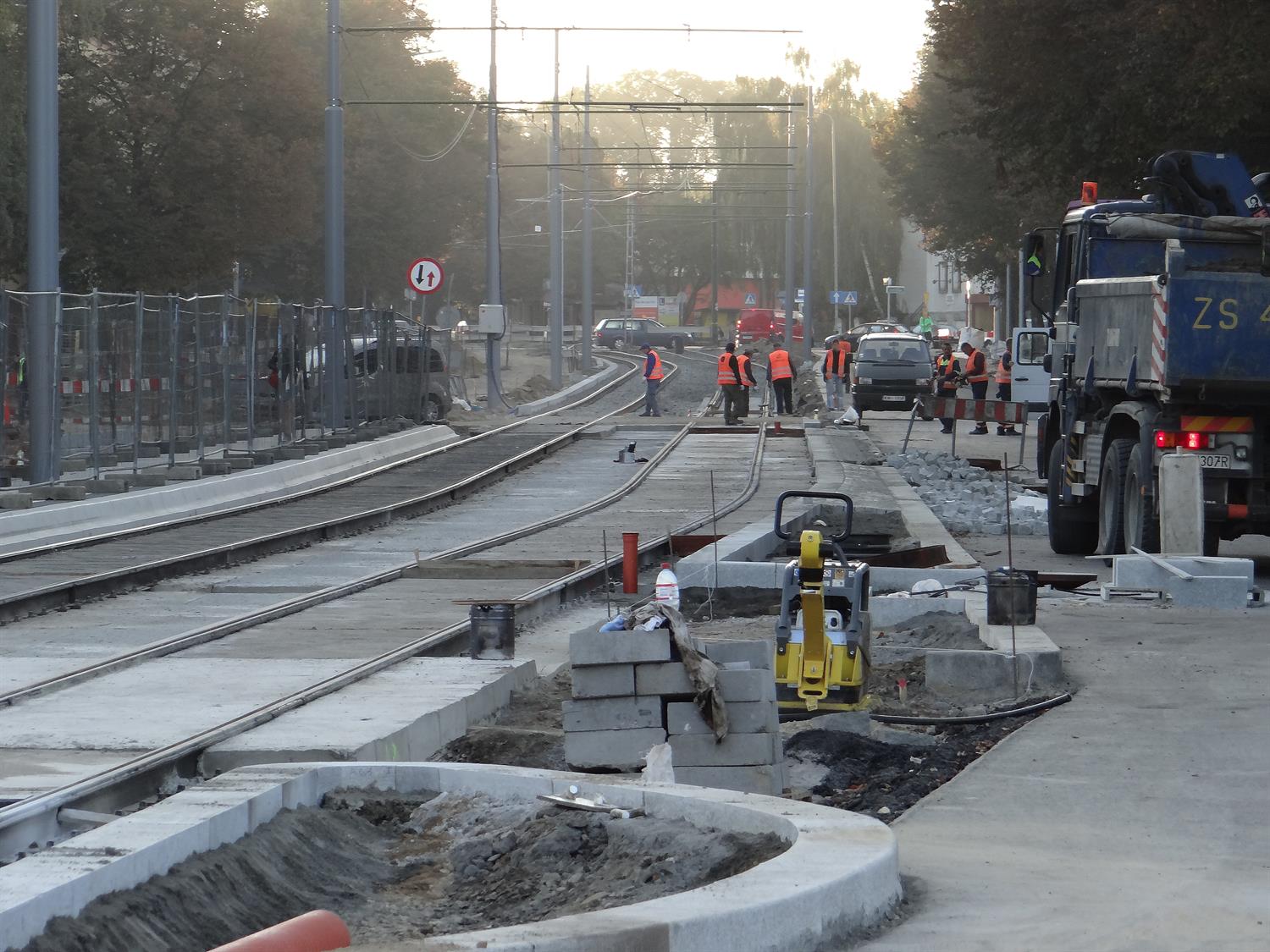 Zarys kształtu przyszłego ronda już widać. Niemal kompletny jest pas torowiska. Ostatnie odcinki toru do centrum są teraz montowane. Do wykonania pozostały wylewki betonowe międzytorzy. Od skrzyżowania ul. Żołnierskiej z ul. Somosierry w kierunku centrum oraz na wlocie w ul. Reduty Ordona i końcowym odcinku dojazdowym ul. Czorsztyńskiej do ul. Mickiewicza wylana została już nakładka asfaltowa. Ułożone zostały chodniki, trwają na nich prace wykończeniowe brukarskie w miejscach, gdzie są studzienki, przy obrzeżach w pobliżu drzew i plantowaniu pod nimi ziemi. Z nowa nawierzchnią jest też peron przystanku dla tramwajów z Krzekowa w kierunku centrum. Fragment nowego chodnika pojawił się też przy zakręcie od wyjazdu na przyszłe rondo z ul. Wernyhory, kostką wykładany jest tam równocześnie pas nowej zatoki dla autobusów.