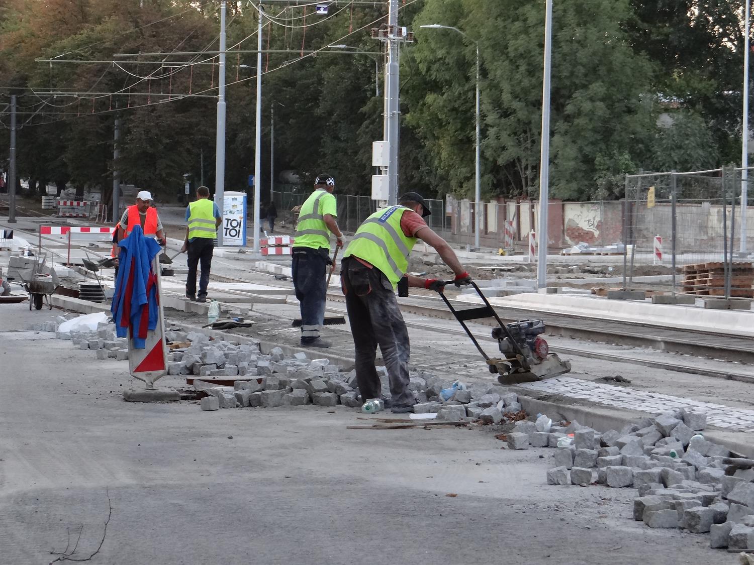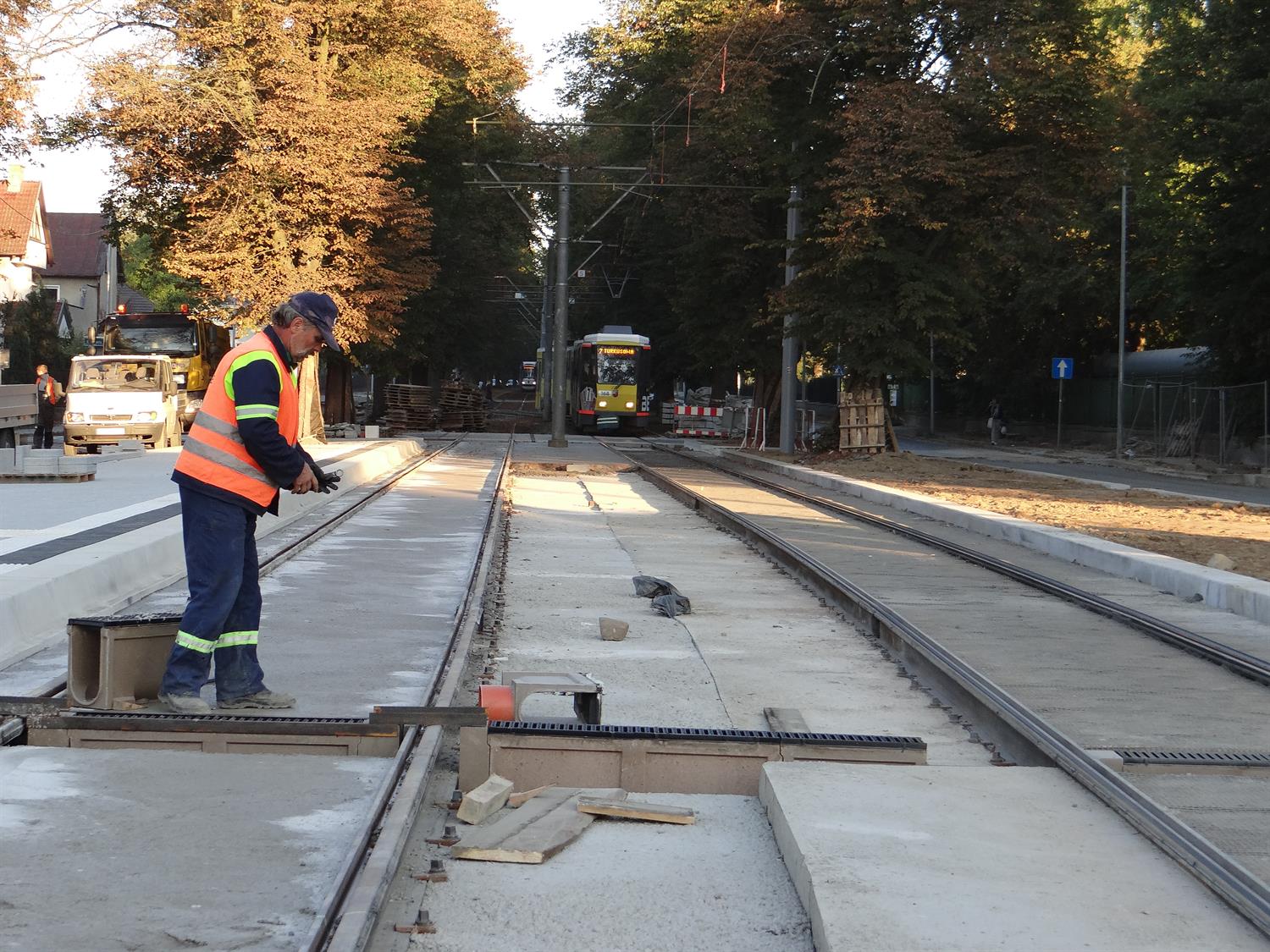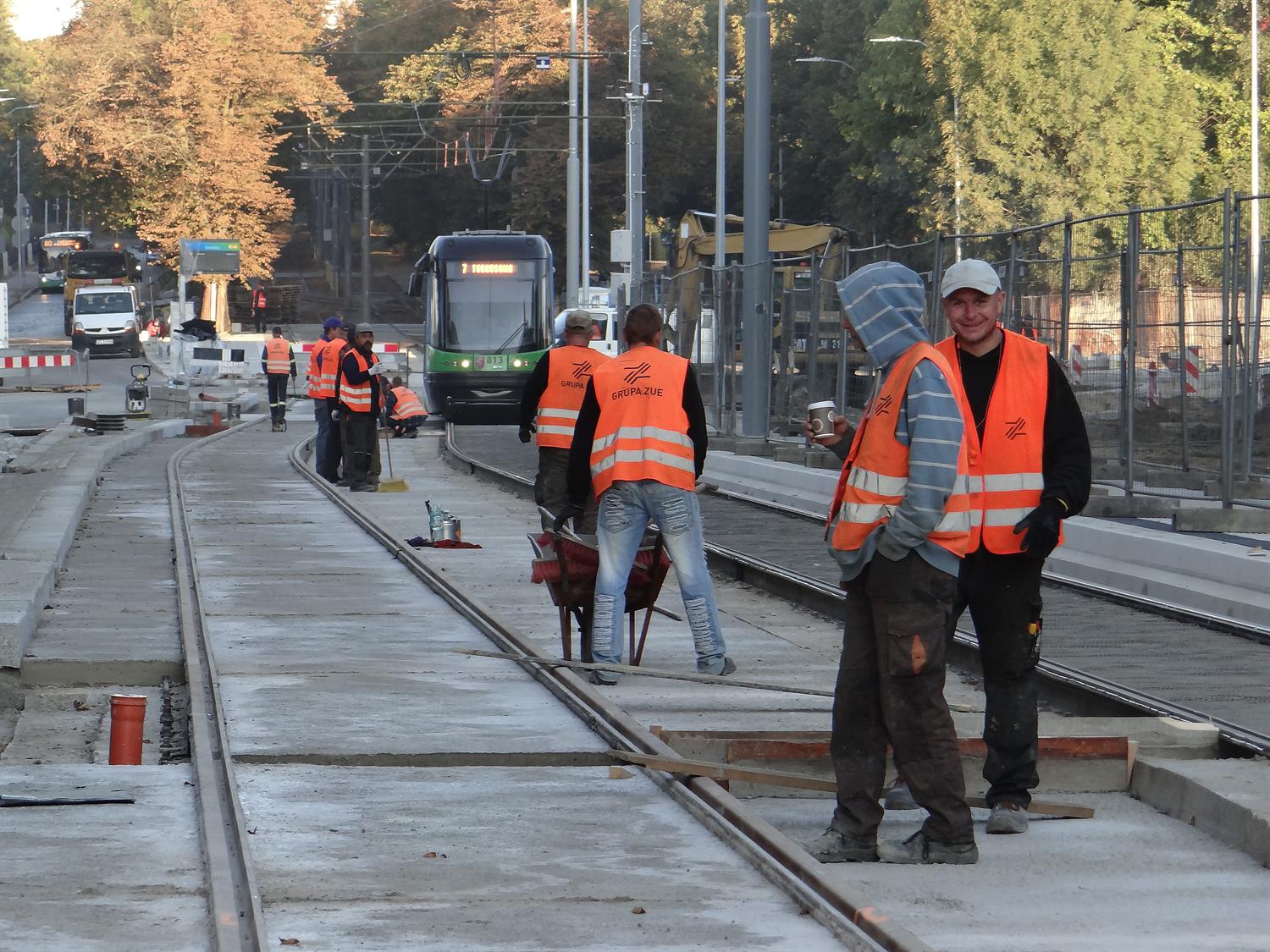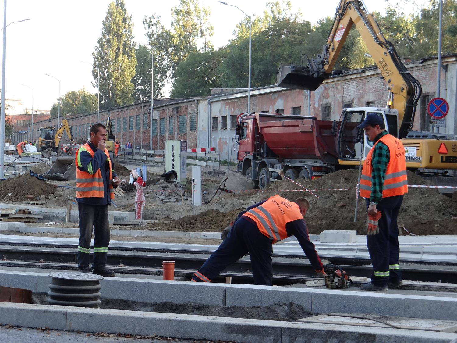 Zarys kształtu przyszłego ronda już widać. Niemal kompletny jest pas torowiska. Ostatnie odcinki toru do centrum są teraz montowane. Do wykonania pozostały wylewki betonowe międzytorzy. Od skrzyżowania ul. Żołnierskiej z ul. Somosierry w kierunku centrum oraz na wlocie w ul. Reduty Ordona i końcowym odcinku dojazdowym ul. Czorsztyńskiej do ul. Mickiewicza wylana została już nakładka asfaltowa. Ułożone zostały chodniki, trwają na nich prace wykończeniowe brukarskie w miejscach, gdzie są studzienki, przy obrzeżach w pobliżu drzew i plantowaniu pod nimi ziemi. Z nowa nawierzchnią jest też peron przystanku dla tramwajów z Krzekowa w kierunku centrum. Fragment nowego chodnika pojawił się też przy zakręcie od wyjazdu na przyszłe rondo z ul. Wernyhory, kostką wykładany jest tam równocześnie pas nowej zatoki dla autobusów.