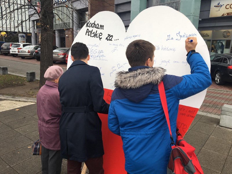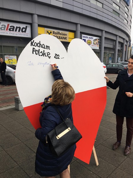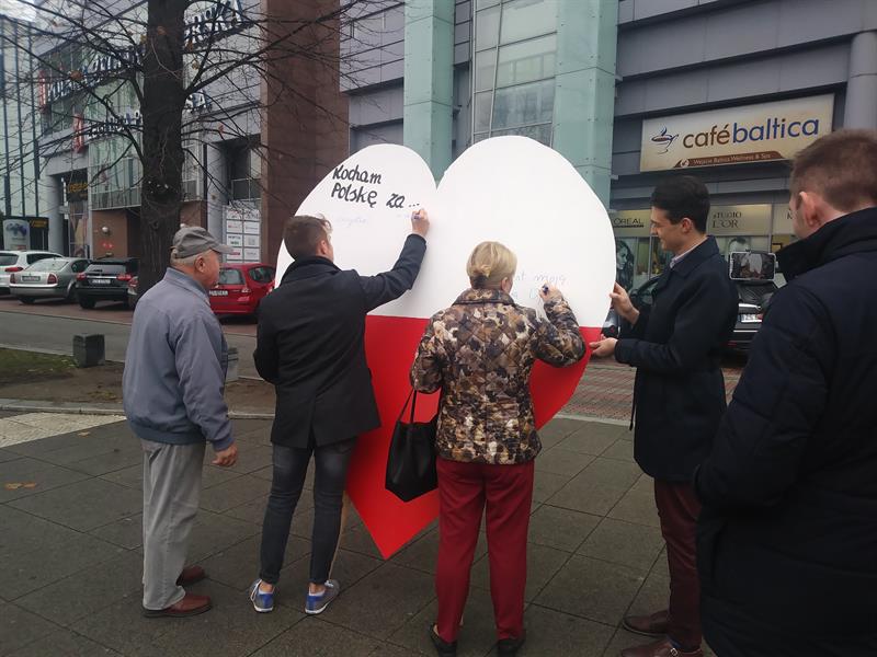 Szczecinianie bardzo licznie wpisywali się na biało-czerwonym sercu, okazując swą miłość do ojczyzny. Szybko wypełniło się ono m.in. takimi frazami jak: "bo jest to moja kochana ojczyzna", "za to, że jest piękna i nas karmi", "za historię, język i oryginalność", "za Adama Mickiewicza".