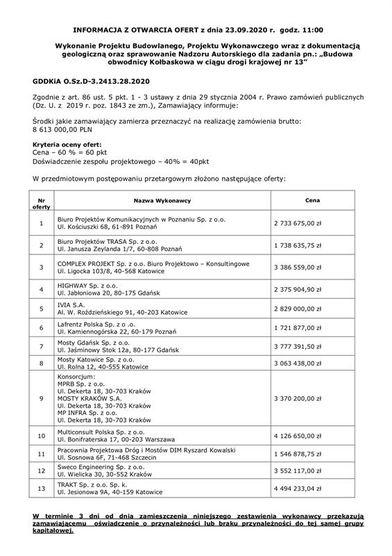 - Wpłynęło łącznie 13 ofert, których wartość wynosi od 1,54 do 4,49 mln złotych. Złożone przez firmy projektowe oferty będą teraz sprawdzane - dodaje rzecznik Generalnej Dyrekcji Dróg Krajowych i Autostrad, Oddział w Szczecinie.