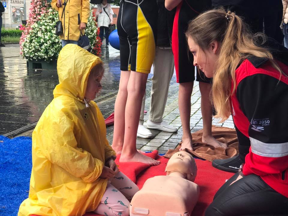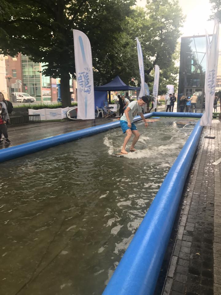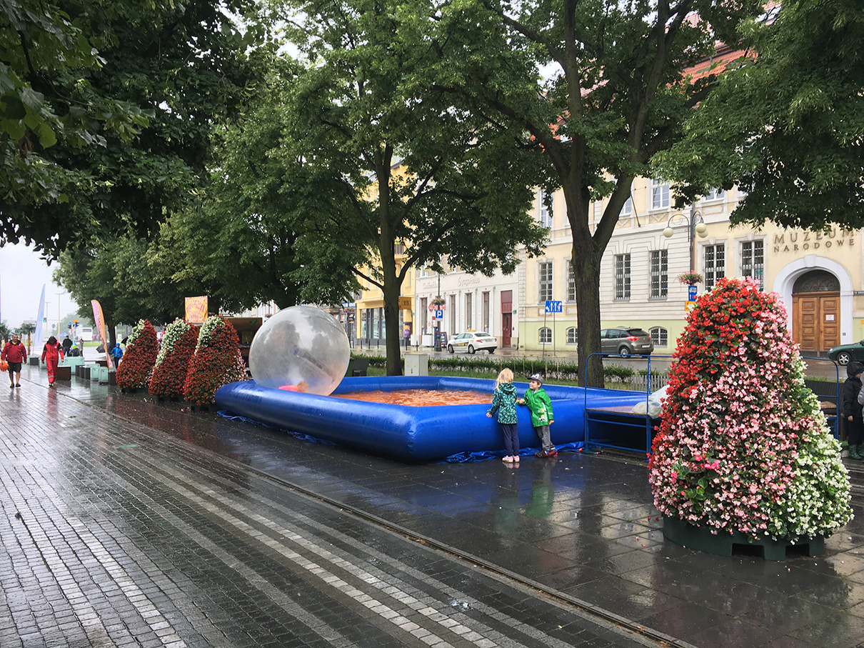 Są rozgrywane zawody w ślizgu na desce po torze wodnym. Na wszystkich chętnych wciąż czeka basen z waterballem, czyli okazja do skakania i bieganie po wodzie w olbrzymiej plastikowej kuli. Są stoiska z fantazyjnymi balonami, malowaniem twarzy i nie mniej estremalna Strefa Małego Ratownika, wzorowana na "Słonecznym patrolu". Mnóstwo zabawy, konkursów z nagrodami i parasolów, pod którymi niektórzy nawet próbują plażować na leżakach usatwionych pod palmami, jakie stanęły w strefie słonecznego zegara, tonącego teraz tyleż w deszczu, ileż w piasku.