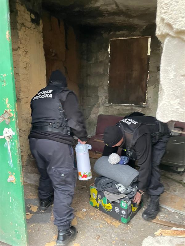 Bezdomny mężczyzna koczuje w nieocieplonym budynku bez szyb przy ul. Ostrowskiej w Szczecinie. Strażnicy miejscy, którzy znają jego sytuację, przywieźli mu płyty do zaślepienia okien i złożyli się na opał do piecyka. Dostarczyli też odzież, kołdry i artykuły spożywcze.