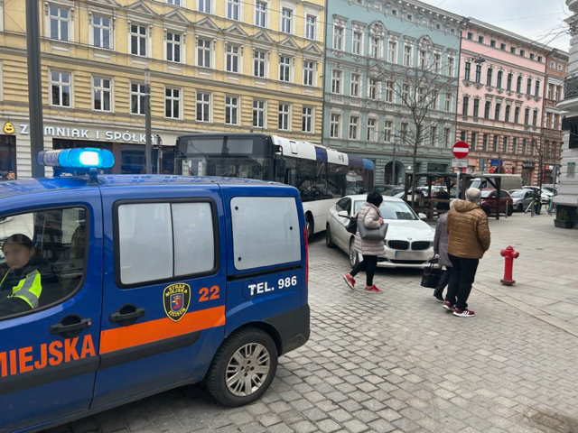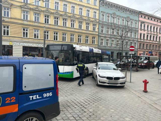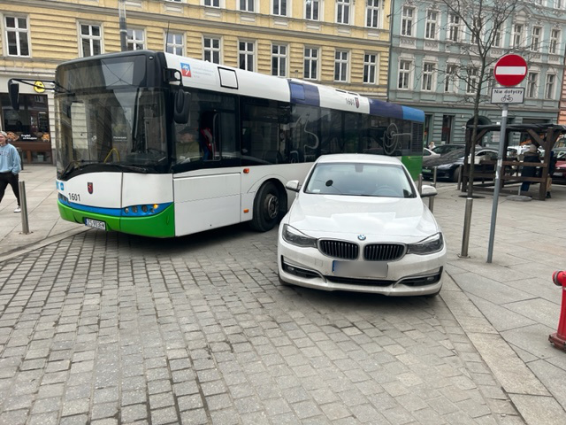 To nie pierwszy raz na tym odcinku ulicy BMW i jakieś Mercedesy blokują ulice. To jest nagminne. Koleś sobie parkuje gdzie mu najwygodniej i najbliżej do knajpki i ma w nosie cały ruch uliczny. Ważne, że on zaparkował. Gdzie jest Straż Miejska? Dlaczego nie ma patroli w takich miejscach? Dopiero jak autobus nie może przejechać, zjawiają się po kku telefonach panowie że Straży. Ręce opadają .