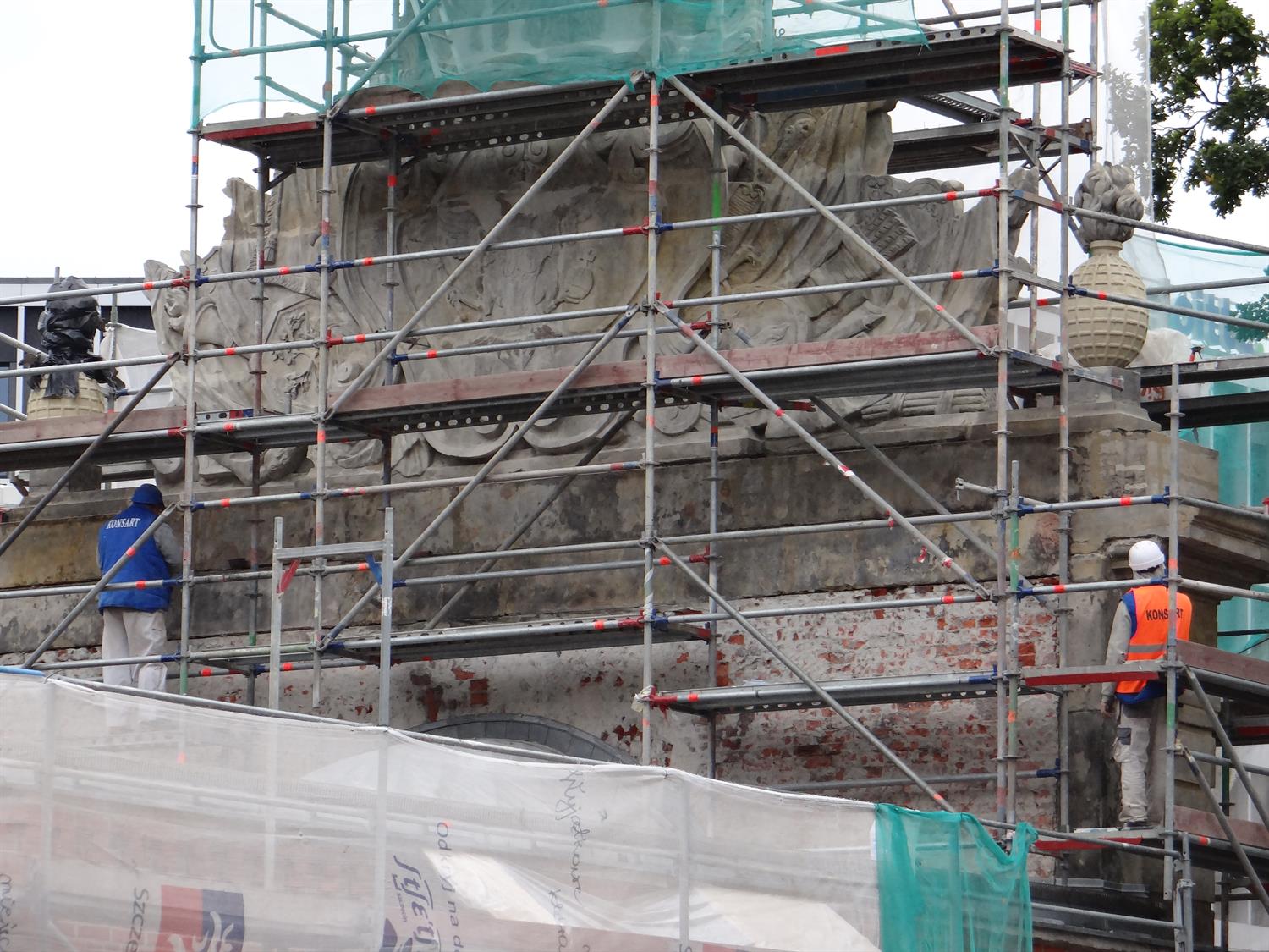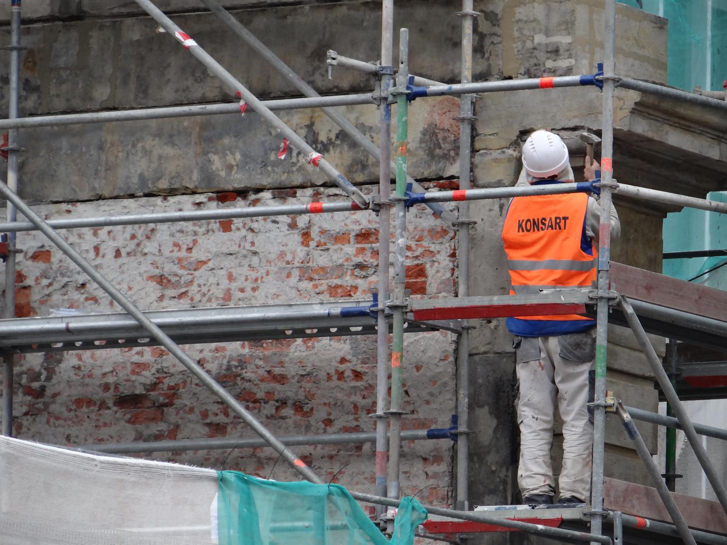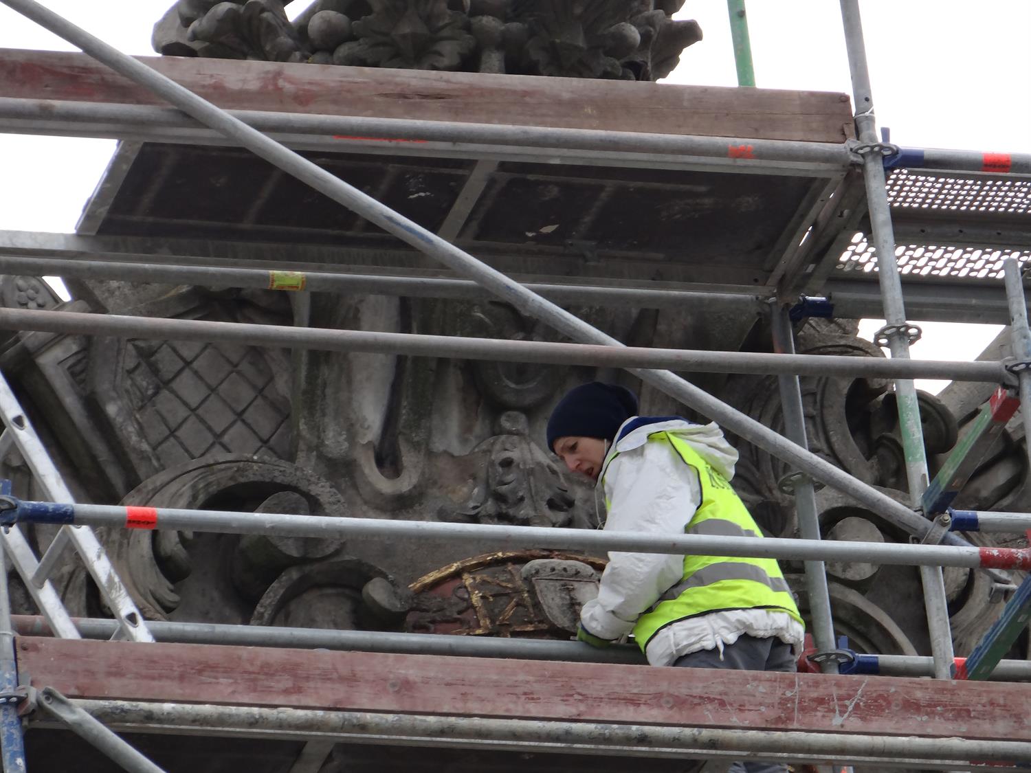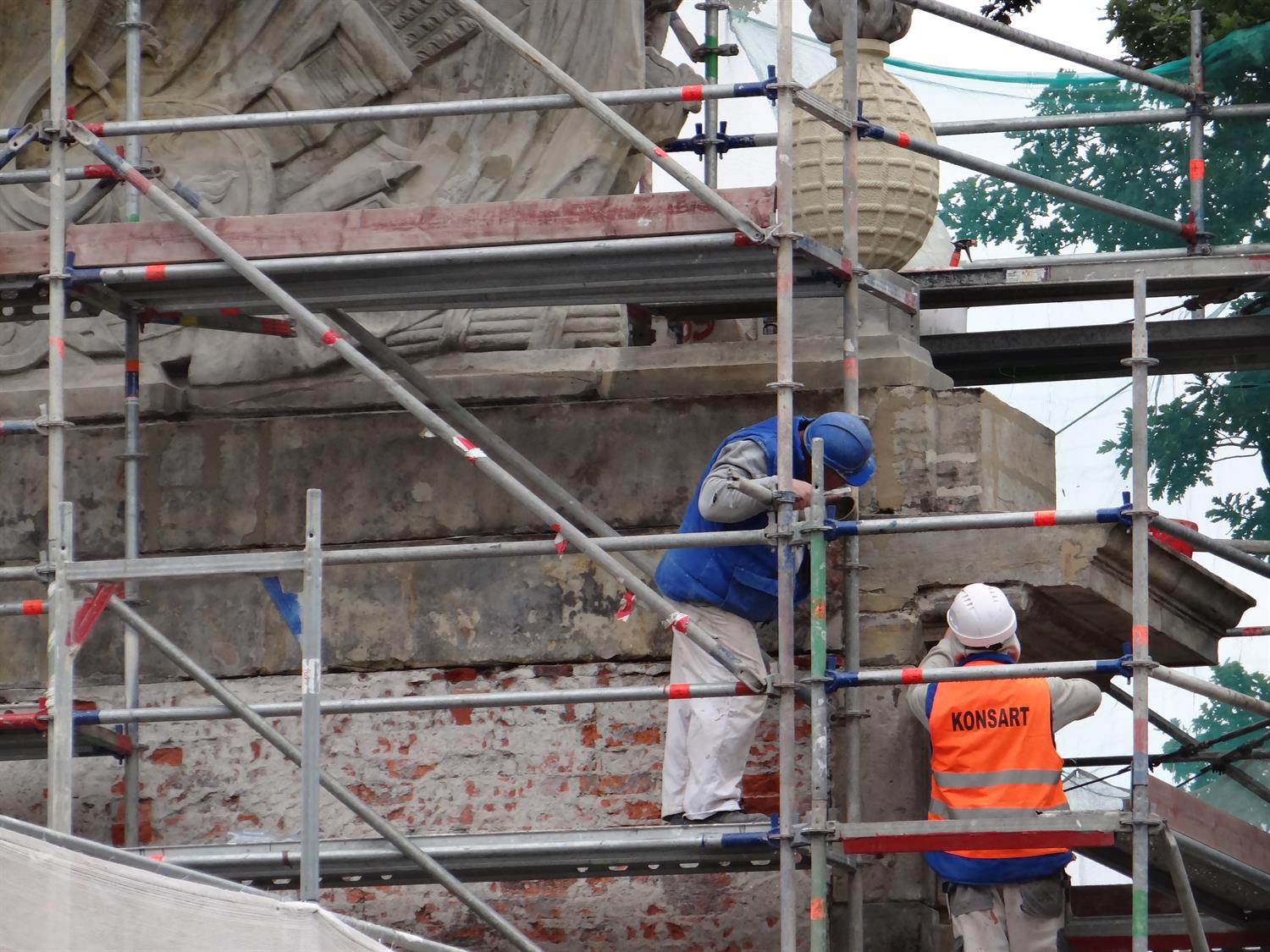 Prace rozpoczęły się od oczyszczania z zewnątrz murów budowli w części przyziemia od strony torowiska dla tramwajów. Specjaliści z firmy Konsart równocześnie prowadzą roboty przy elewacji od strony szaletu. Rozpoczęli również zabiegi przy uzupełnianiu ubytków i odnawianiu bogato dekorowanych detalami architektonicznymi obu wejść bramy.