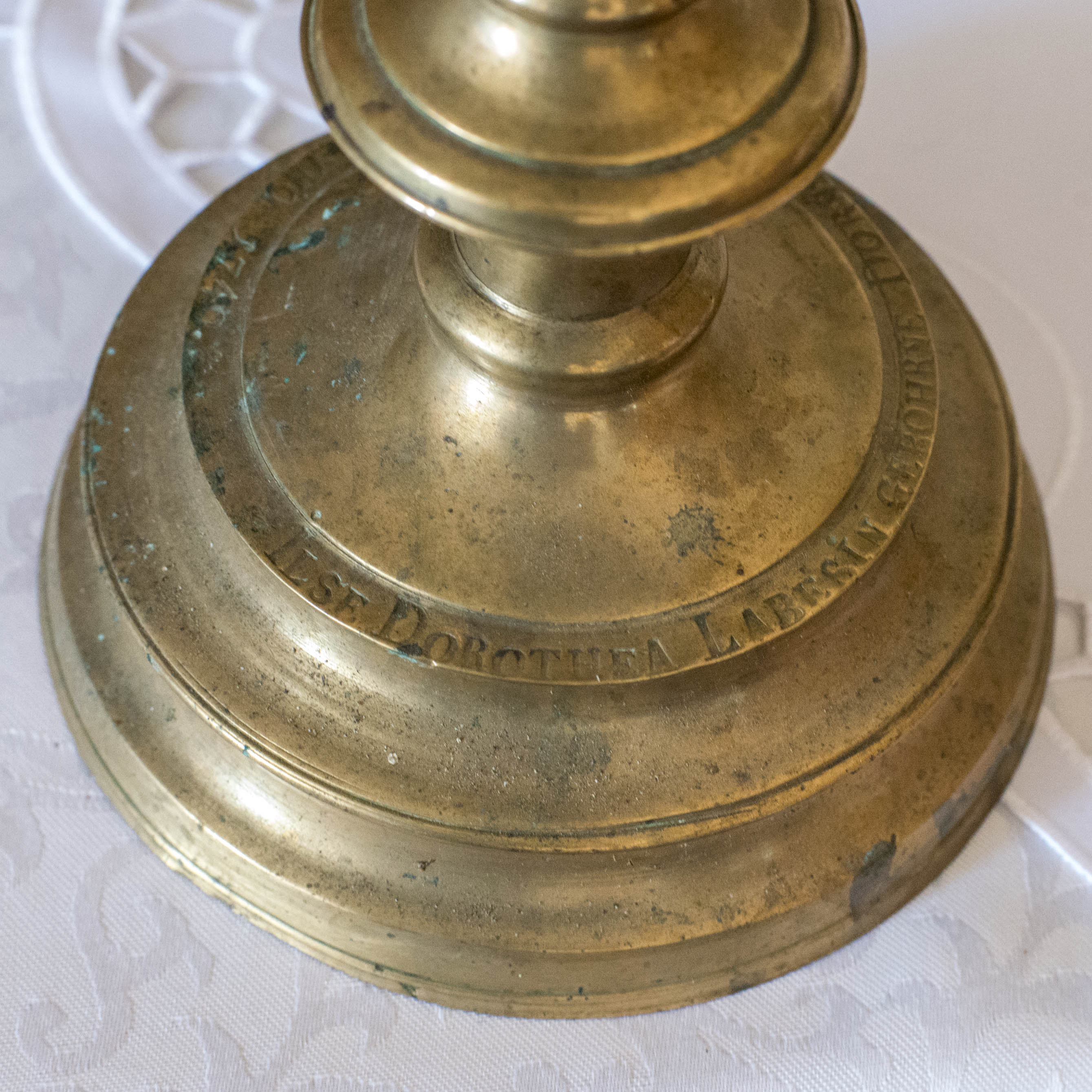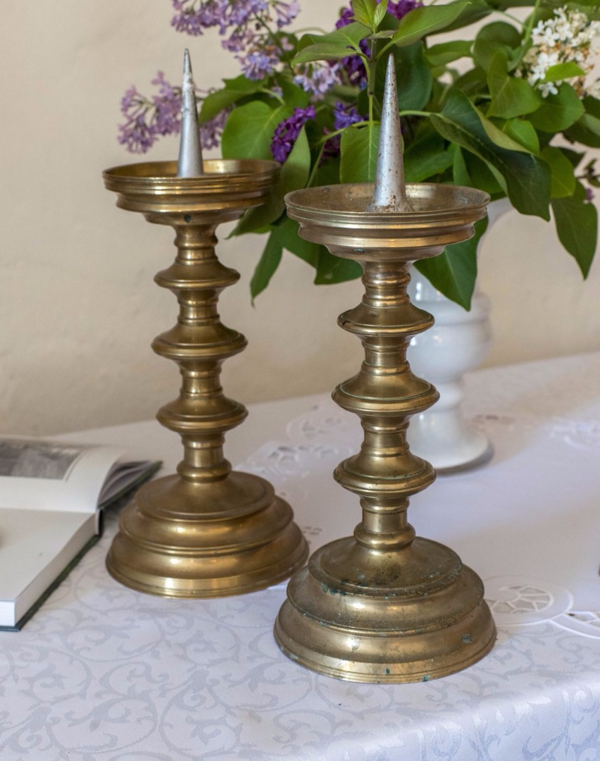 Na młodszych lichtarzach z 1740 roku zachowała się inskrypcja wykonana majuskułą umożliwiająca ich bezsprzeczną identyfikację: ILSE DOROTHEA LEBENSIN GEBHORENE DORNCRELLIN PASTORINN ANNO 1740. Świeczniki ufundowane były przez Ilsę Dorotę Labesin. Pochodzą z późnego renesansu, wykonane są z mosiądzu. Starsze lichtarze z XVII w. nie posiadały żadnych inskrypcji.