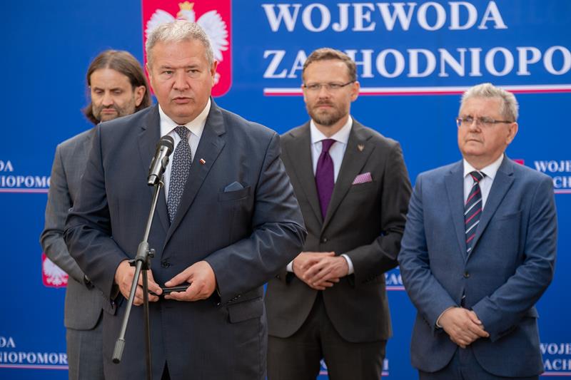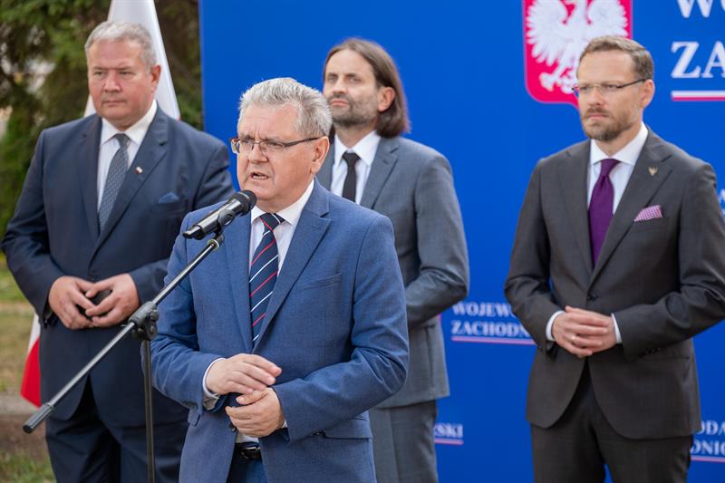 Poseł Leszek Dobrzyński, wiceminister Piotr Bromber, zastępca dyrektora ZCO Zbigniew Dudziński i wojewoda zachodniopomorski Zbigniew Bogucki podczas przekazania symbolicznego czeku. Fot. Dariusz Gorajski
