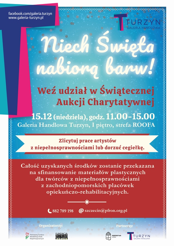 Oddział Zachodniopomorski Państwowego Funduszu Rehabilitacji Osób Niepełnosprawnych oraz Fundacja Witryna Kultury wraz z Galerią Handlową Turzyn organizują w tym tygodniu akcję charytatywną na rzecz niepełnosprawnych artystów plastyków. Od poniedziałku do soboty (9-14 grudnia) w centrum trwa ekspozycja prac pochodzących z konkursu plastycznego adresowanego do osób z niepełnosprawnościami organizowanego przez Oddział Zachodniopomorski PFRON. Ekspozycję można oglądać codziennie w godzinach funkcjonowania centrum. Wystawa mieści się na parterze galerii.