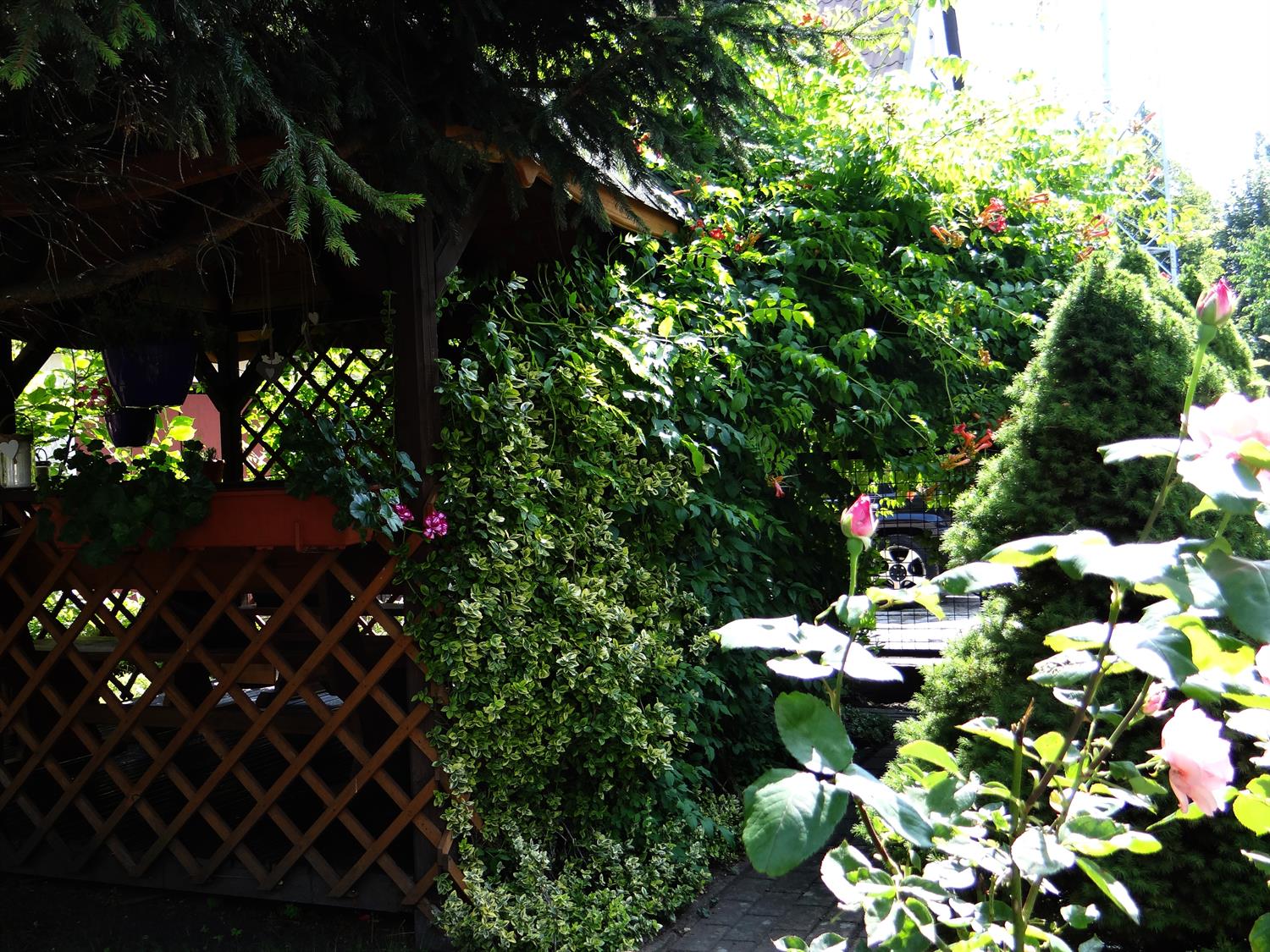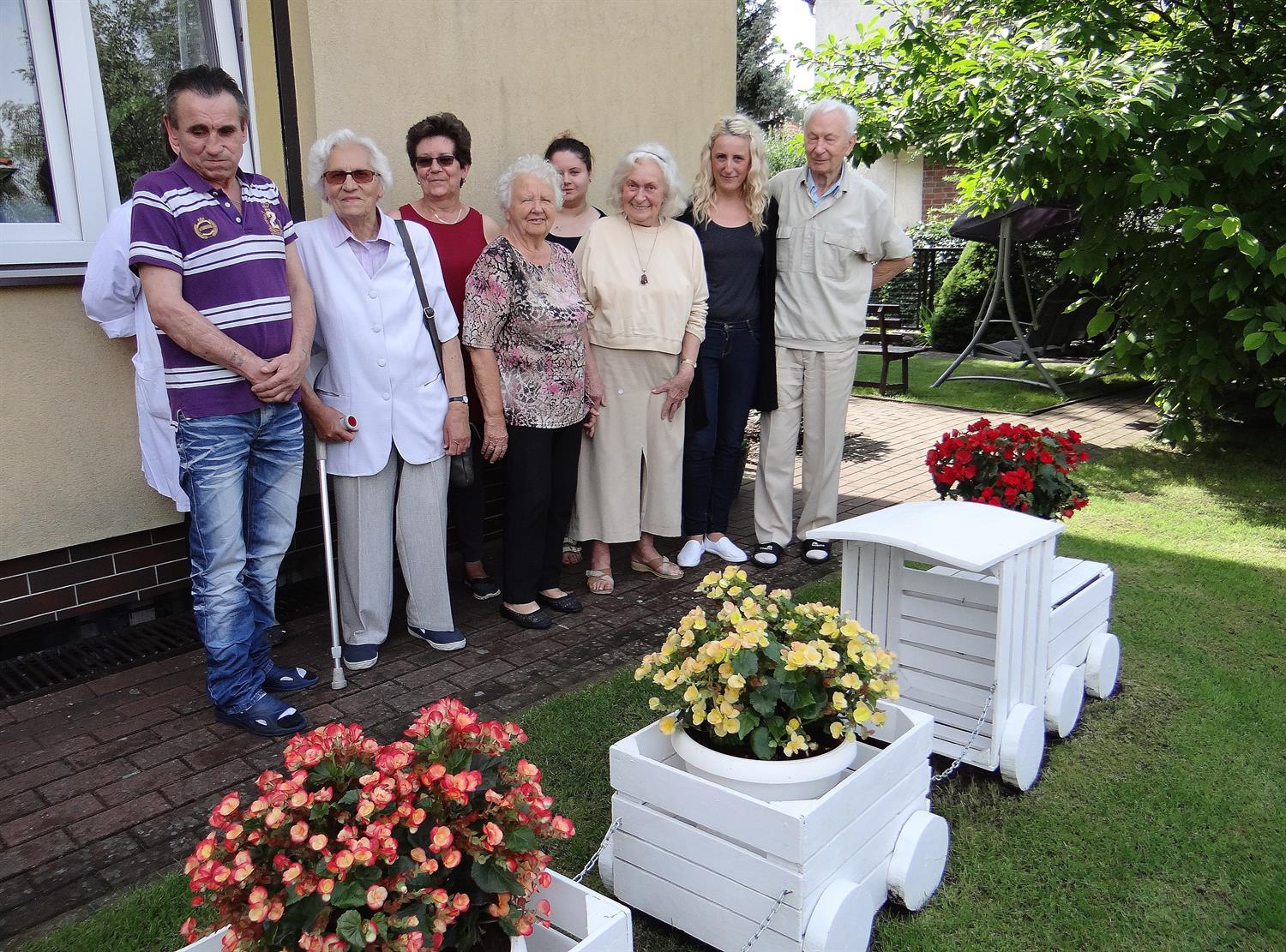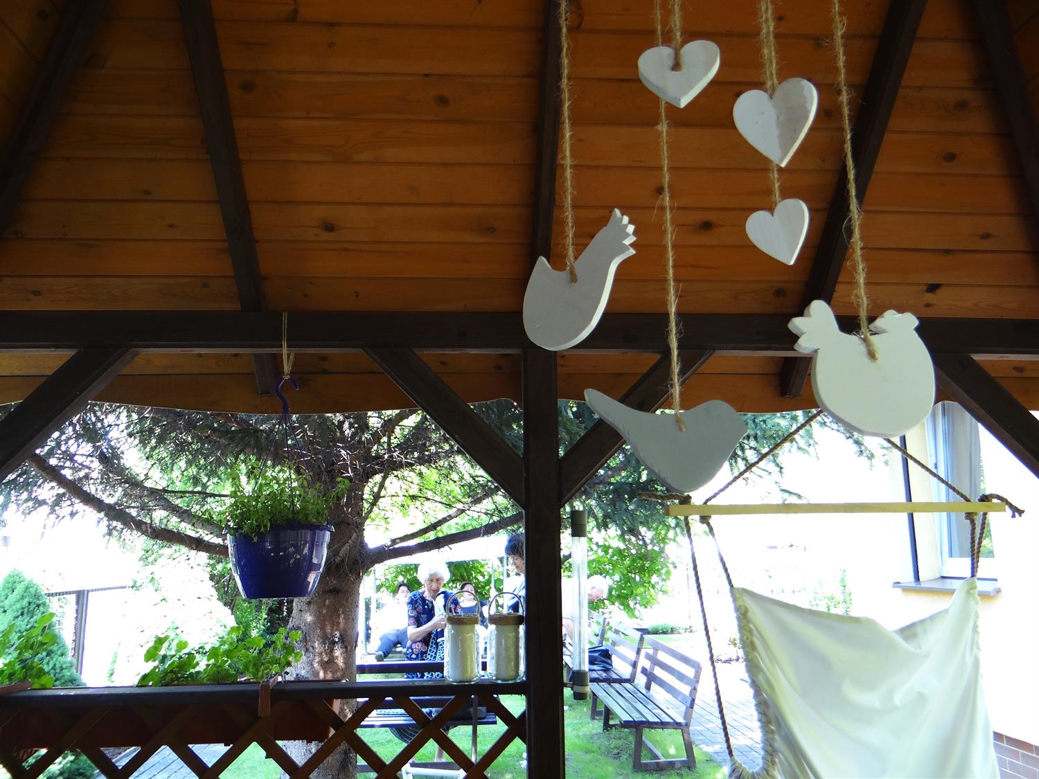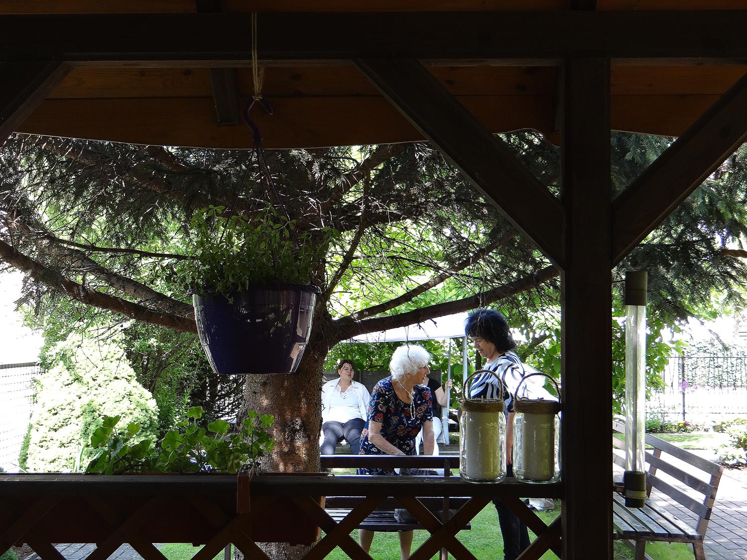 Teren wkoło budynku choć niewielki, to jednak można na nim – jak się okazuje – wyczarować sporo. Świerki, tuje, cyprysy i cisy systematycznie pielęgnowane cieszą oczy 45 podopiecznych placówki, osób starszych. Podobnie, jak rosnące w ogrodzie okazałe magnolie. A w upalne dni dają w swym cieniu chwile odpoczynku na bujanej kanapie, ławeczkach, przy stolikach i drewnianej altanie, którą oplata i porasta pięknie kwitnący milim amerykański. W samej altanie ozdoby wykonane rękoma pensjonariuszy. Tu mogą aktywnie spędzać czas, rozmawiać, brać udział w organizowanych dla nich zajęciach, czytać, śpiewać, grać, a jeśli chcą i pracować w zielonej enklawie, doglądając i pielęgnując posadzone przez siebie kwiaty, krzewy, zioła.