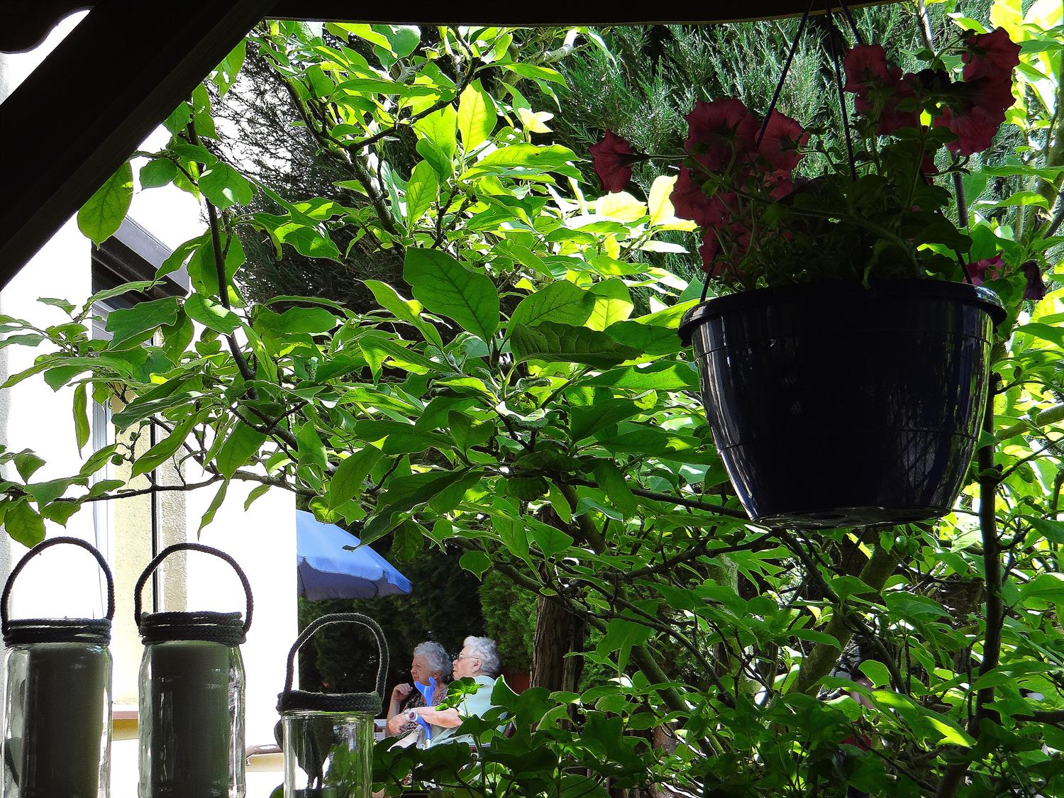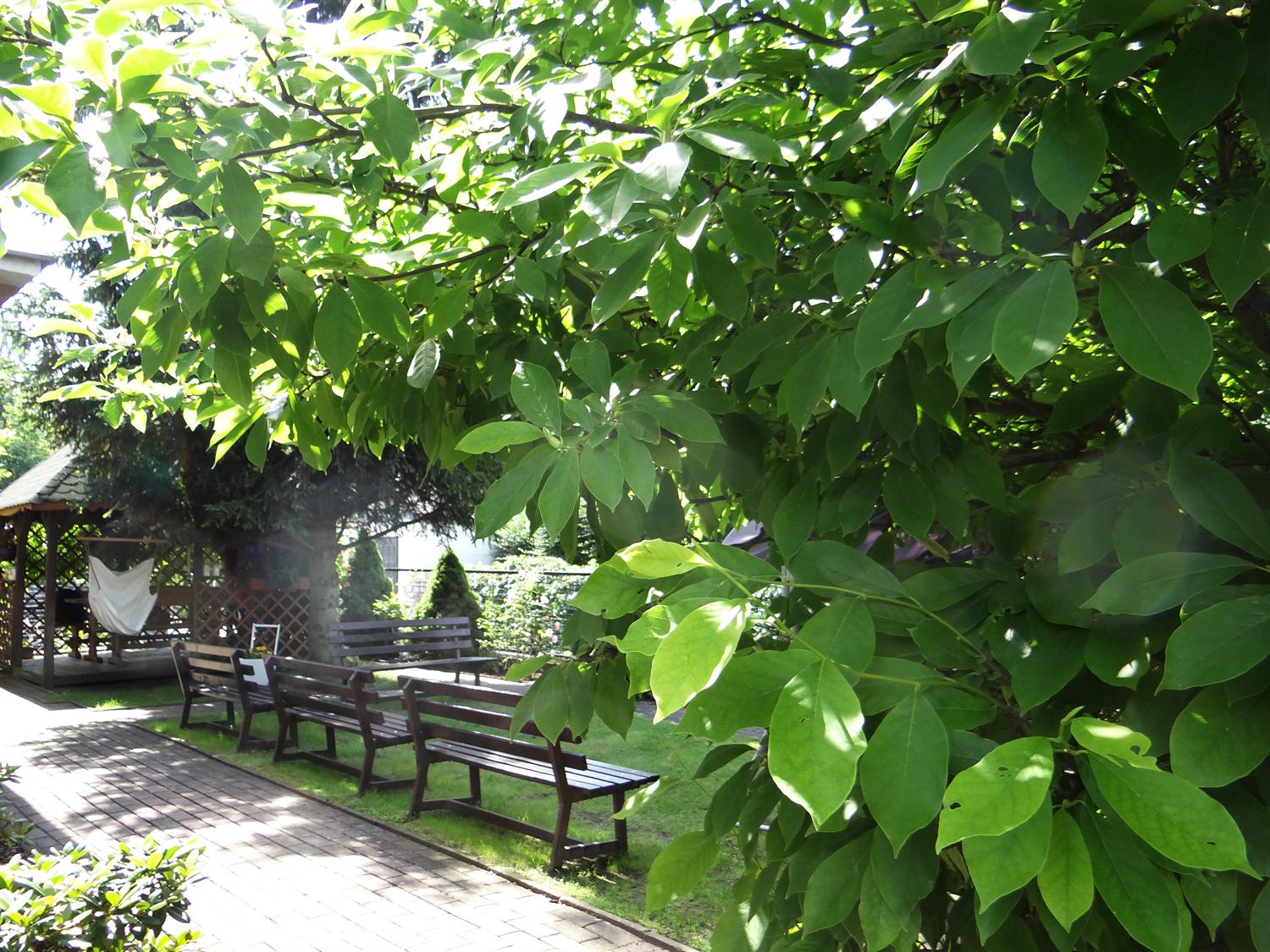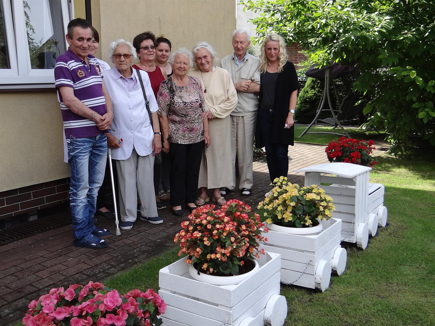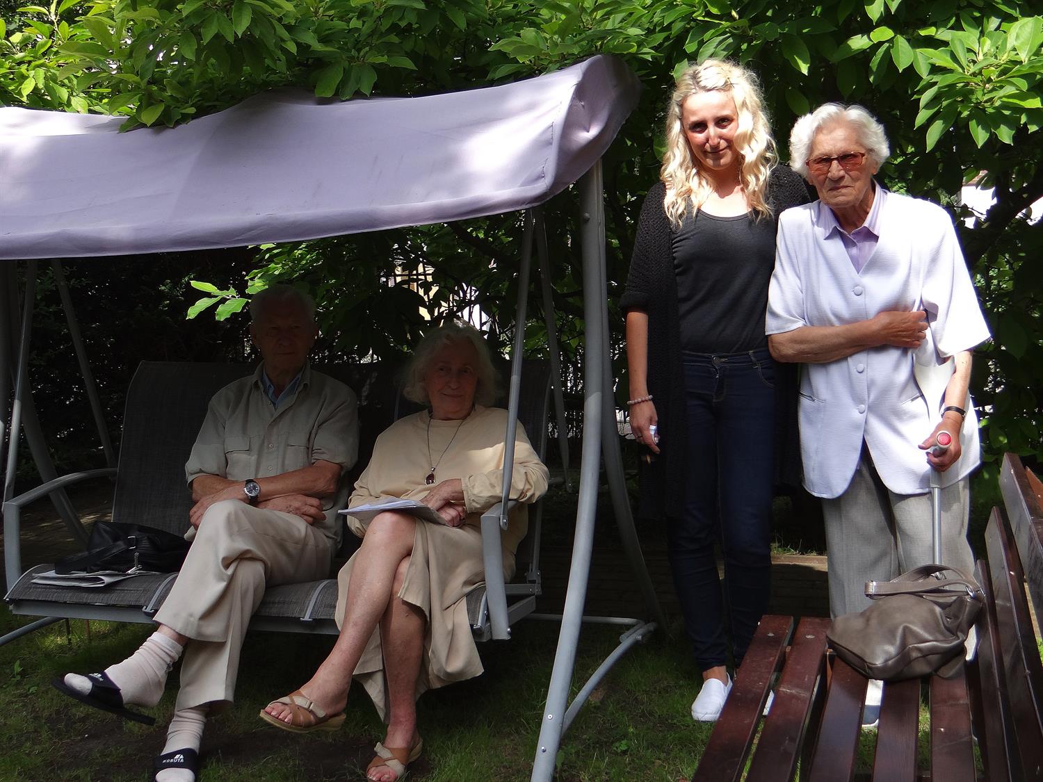 Teren wkoło budynku choć niewielki, to jednak można na nim – jak się okazuje – wyczarować sporo. Świerki, tuje, cyprysy i cisy systematycznie pielęgnowane cieszą oczy 45 podopiecznych placówki, osób starszych. Podobnie, jak rosnące w ogrodzie okazałe magnolie. A w upalne dni dają w swym cieniu chwile odpoczynku na bujanej kanapie, ławeczkach, przy stolikach i drewnianej altanie, którą oplata i porasta pięknie kwitnący milim amerykański. W samej altanie ozdoby wykonane rękoma pensjonariuszy. Tu mogą aktywnie spędzać czas, rozmawiać, brać udział w organizowanych dla nich zajęciach, czytać, śpiewać, grać, a jeśli chcą i pracować w zielonej enklawie, doglądając i pielęgnując posadzone przez siebie kwiaty, krzewy, zioła.