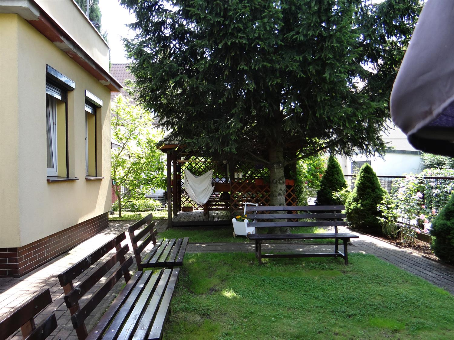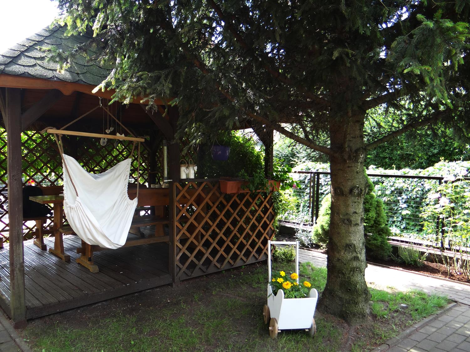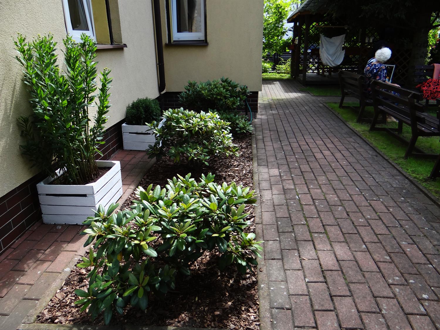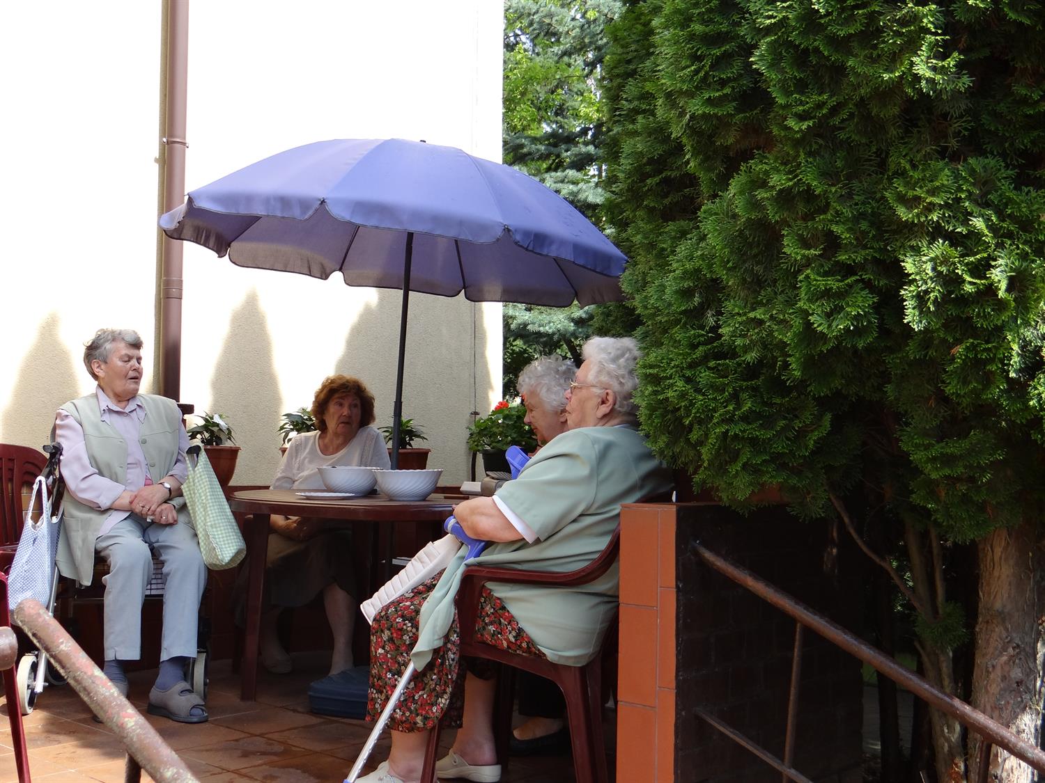 Teren wkoło budynku choć niewielki, to jednak można na nim – jak się okazuje – wyczarować sporo. Świerki, tuje, cyprysy i cisy systematycznie pielęgnowane cieszą oczy 45 podopiecznych placówki, osób starszych. Podobnie, jak rosnące w ogrodzie okazałe magnolie. A w upalne dni dają w swym cieniu chwile odpoczynku na bujanej kanapie, ławeczkach, przy stolikach i drewnianej altanie, którą oplata i porasta pięknie kwitnący milim amerykański. W samej altanie ozdoby wykonane rękoma pensjonariuszy. Tu mogą aktywnie spędzać czas, rozmawiać, brać udział w organizowanych dla nich zajęciach, czytać, śpiewać, grać, a jeśli chcą i pracować w zielonej enklawie, doglądając i pielęgnując posadzone przez siebie kwiaty, krzewy, zioła.