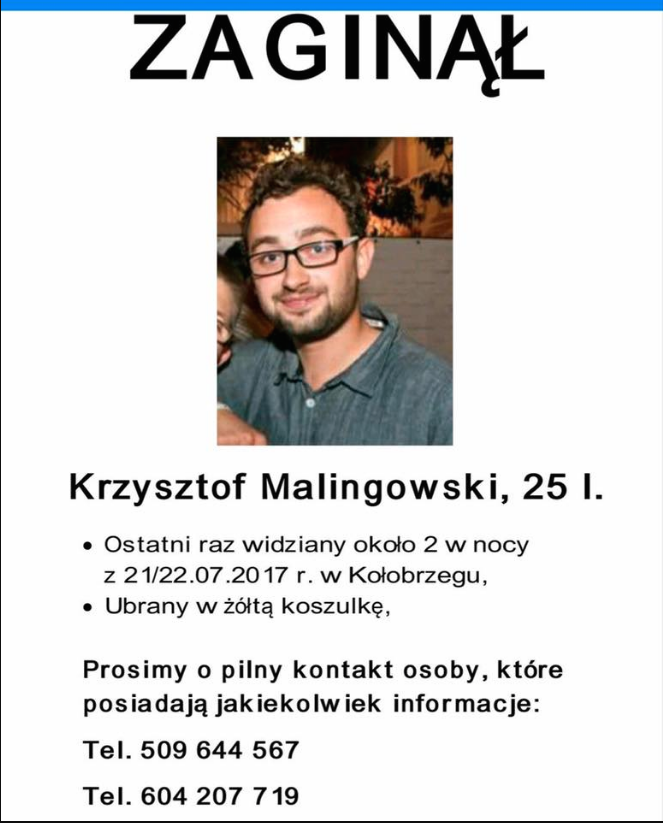 Krzysztofa Malingowskiego, który zaginął na festiwalu Sunrise w Kołobrzegu, poszukuje zrozpaczona rodzina, znajomi i policja.