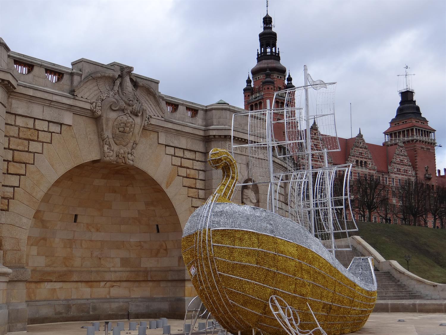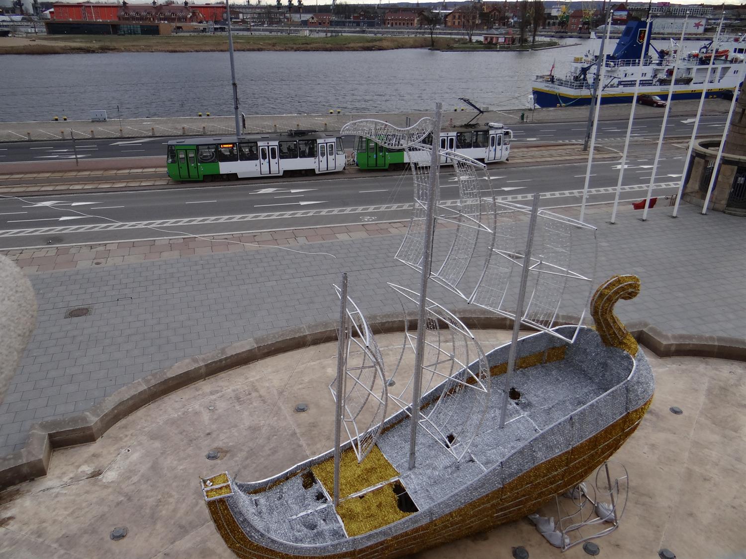 Rozświetlony wieczorami tak prezentuje się za dnia. Mowa o atrapie żaglowca, jaki ustawiony został w misie fontanny przy Wałach Chrobrego w Szczecinie. Jak już pisaliśmy na naszych łamach, zdążył stać się dodatkową atrakcją podczas spacerów. Na jego tle szczecinianie i turyści chętnie teraz robią sobie zdjęcia.