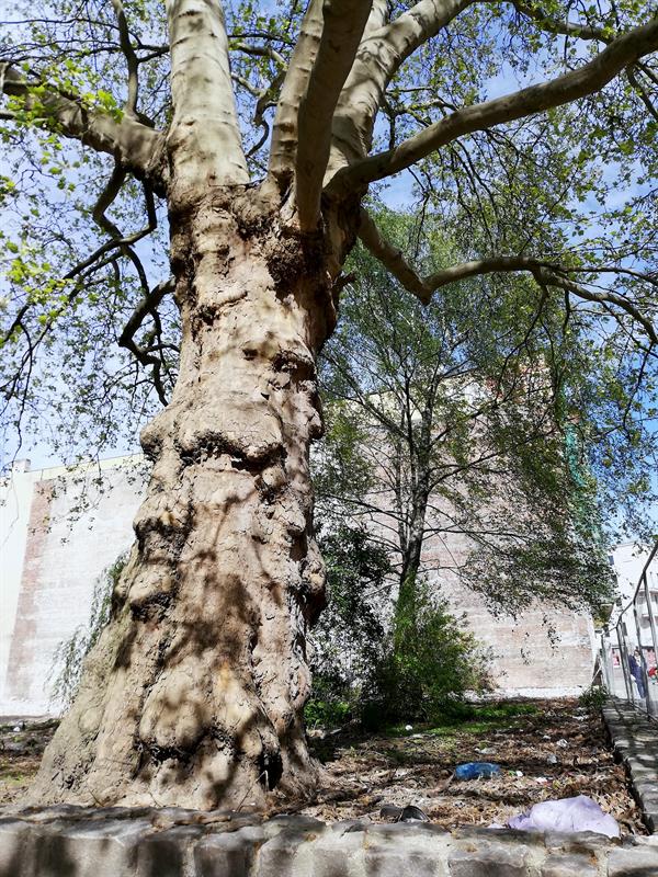 Platan ten jest jednym z nielicznych - poza wierzbą i paroma brzozami - zielonych śladów, jakie przetrwały rozbiórkę Szkoły Podstawowej nr 54 przy ul. Bałuki. Mimo braku zabezpieczenia. Jednak nie wiadomo czy przetrwa kolejną fazę przemiany tej części miasta - "uszczelniania" zabudowy pierzei śródmiejskiego kwartału.